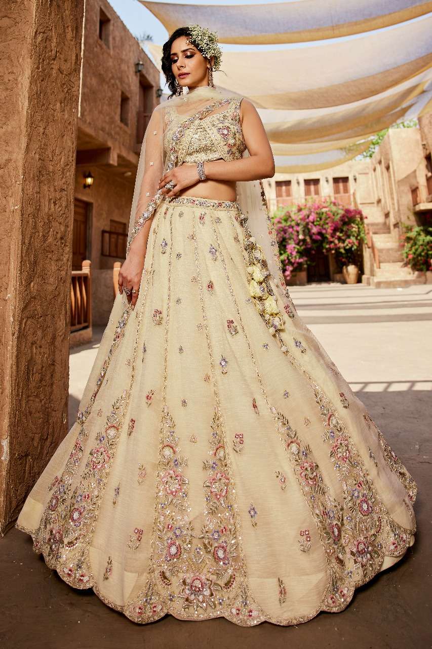 Elevate your style with this premium beige lehenga crafted from luxurious tissue fabric. Its full flair silhouette...