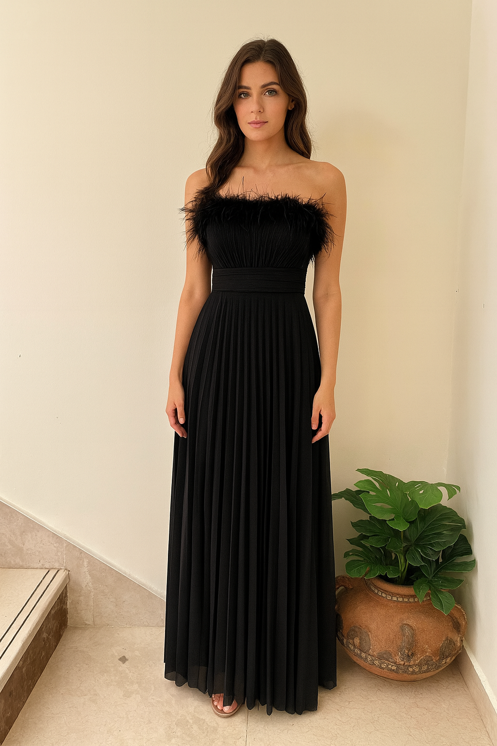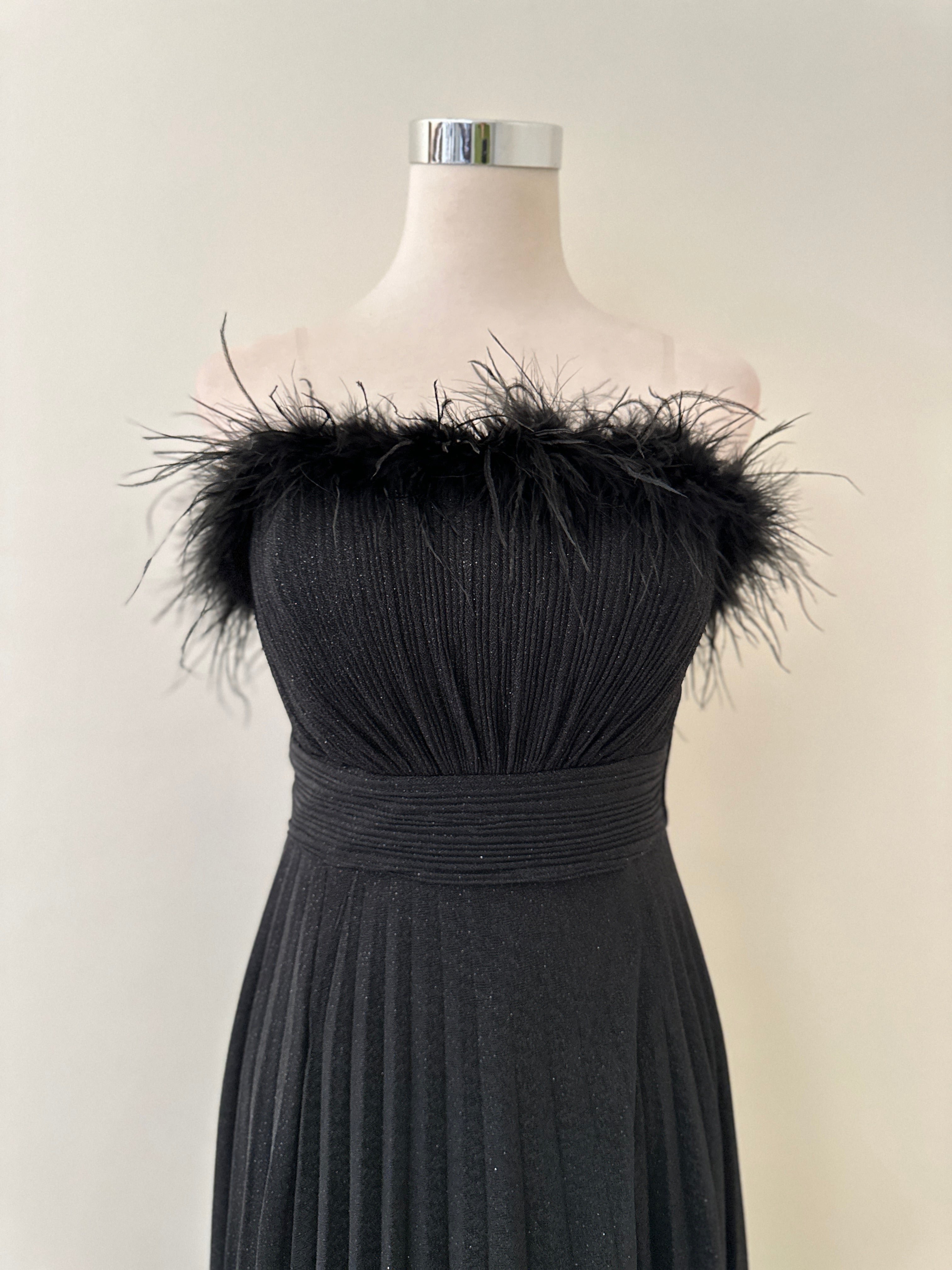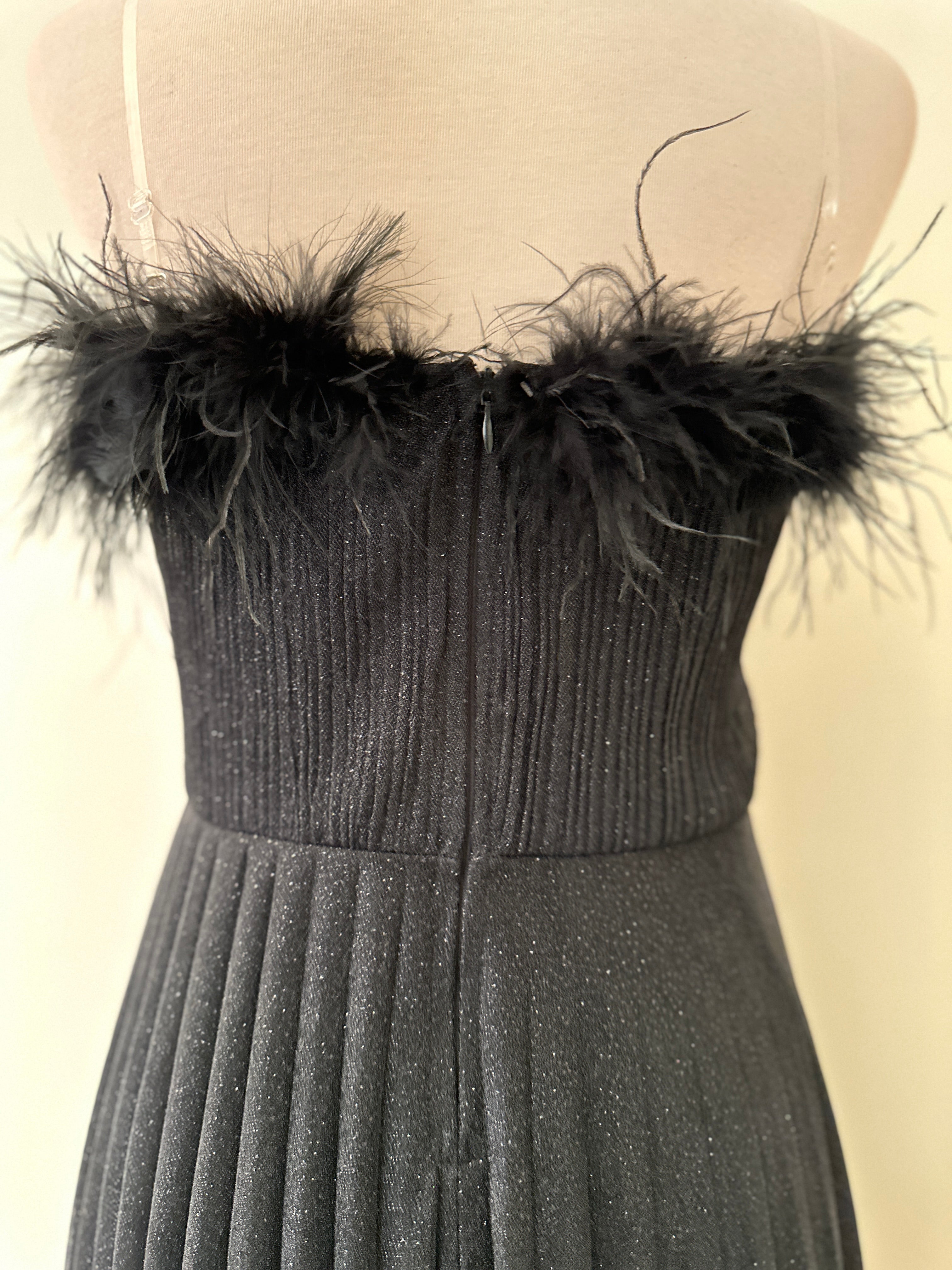 Elevate your style with this Black Fur Dress, featuring a light, shiny fabric that effortlessly catches the light for a striking look. The luxurious fur detail around the neckline adds a touch of elegance, while the sleek tube neckline highlights your shoulders beautifully. Perfect for making a memorable impression at any event.