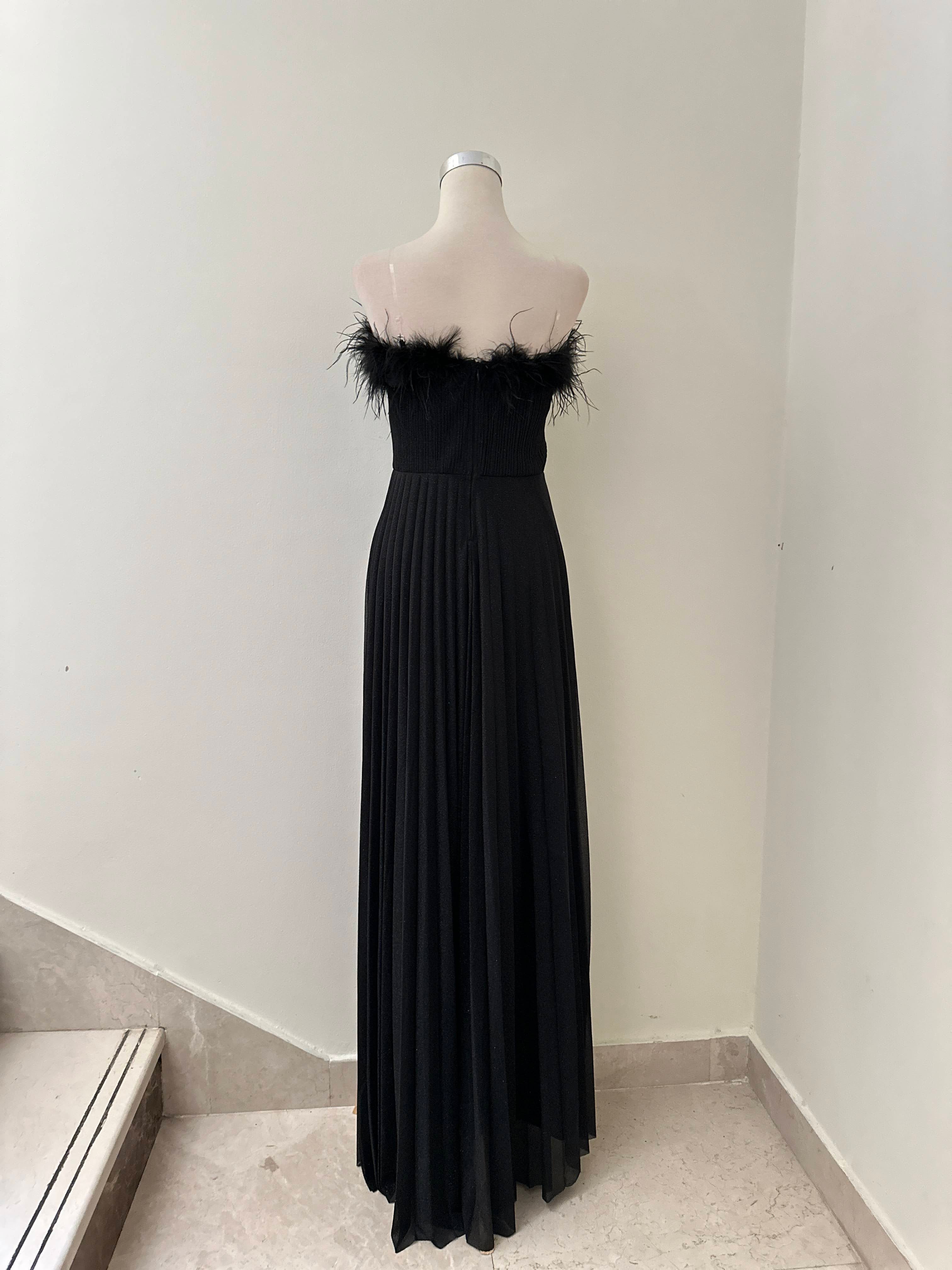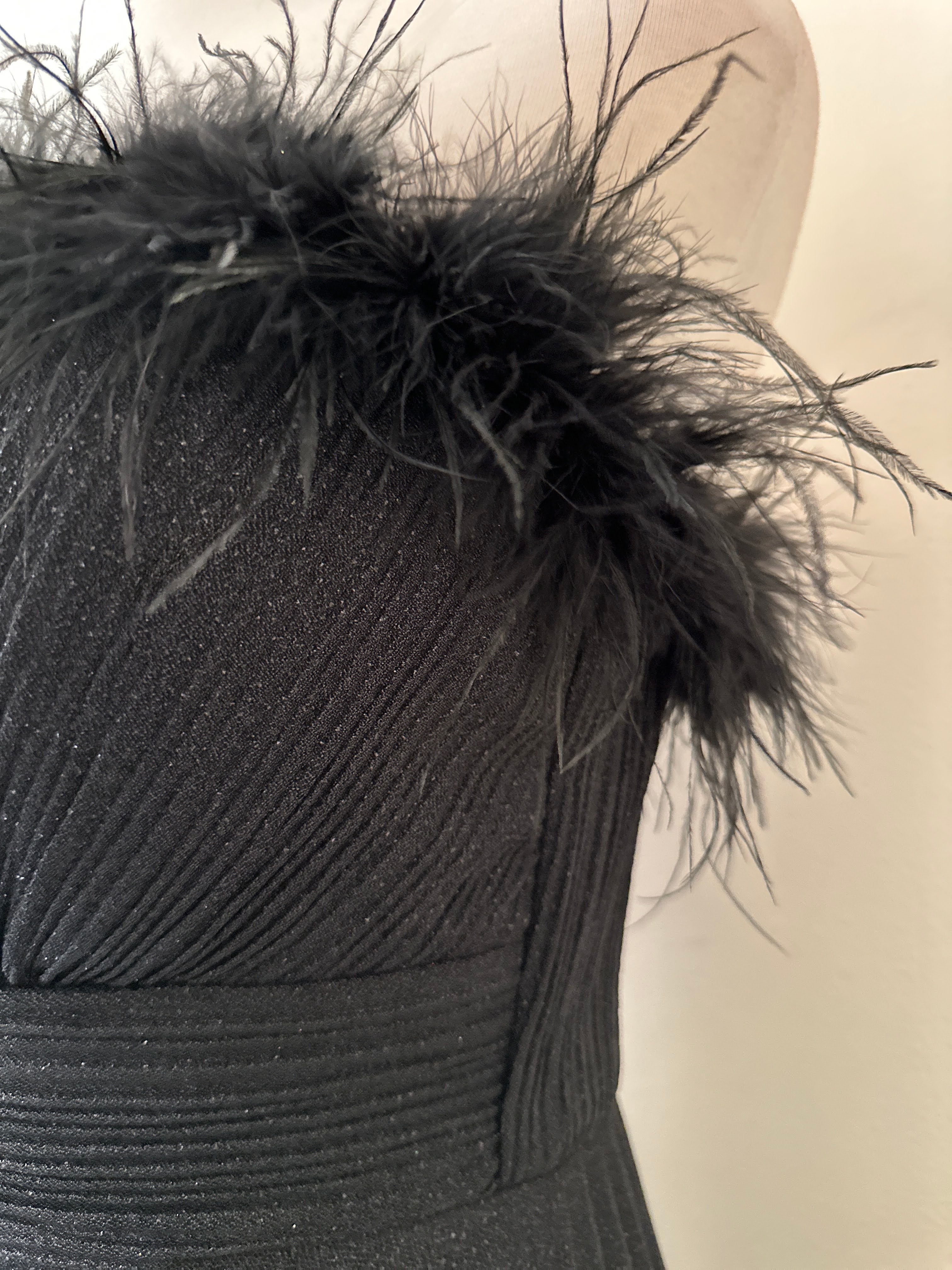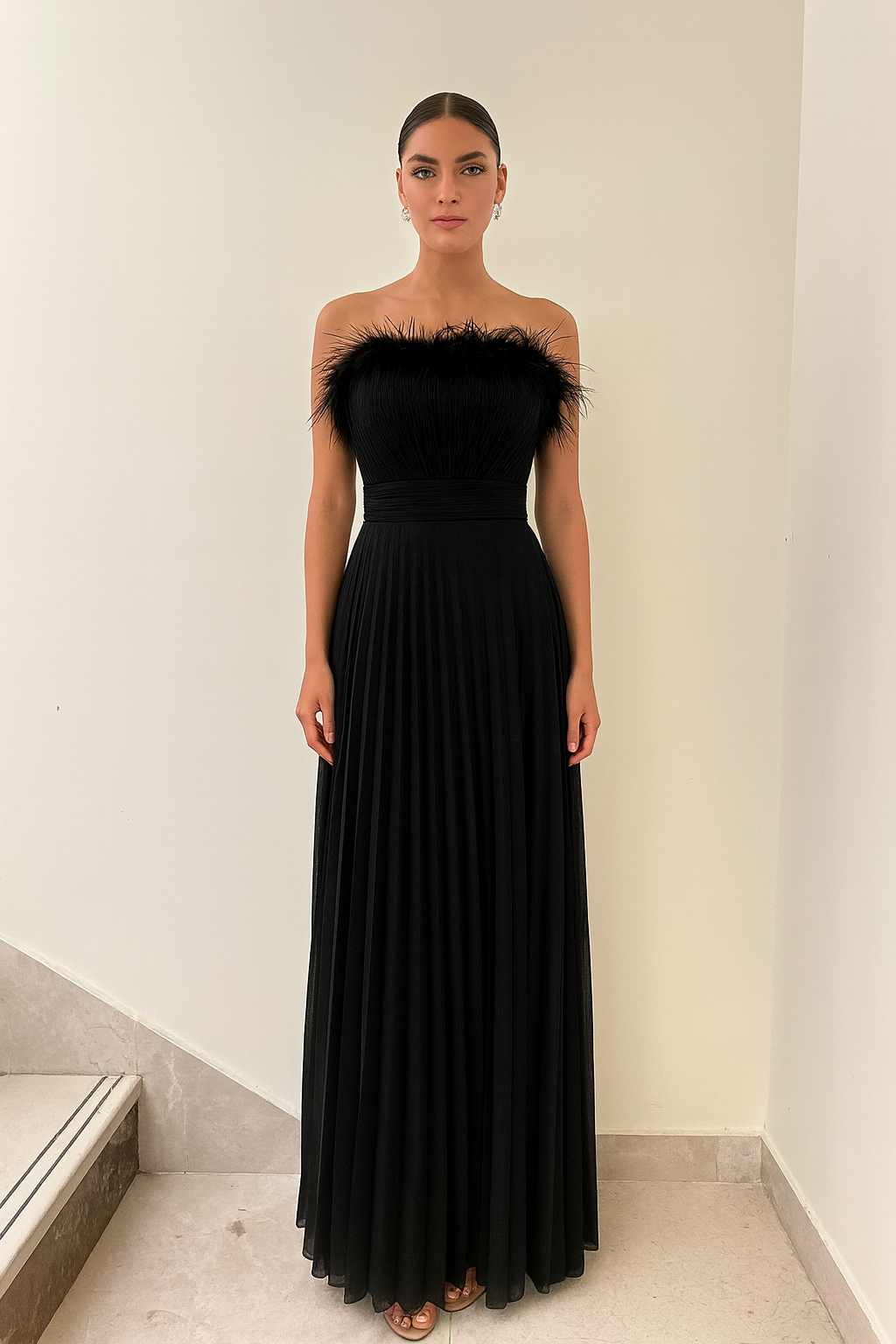 Elevate your style with this Black Fur Dress, featuring a light, shiny fabric that effortlessly catches the light for a striking look. The luxurious fur detail around the neckline adds a touch of elegance, while the sleek tube neckline highlights your shoulders beautifully. Perfect for making a memorable impression at any event.