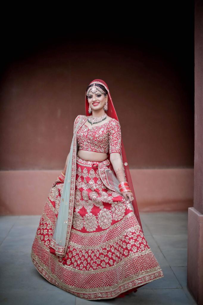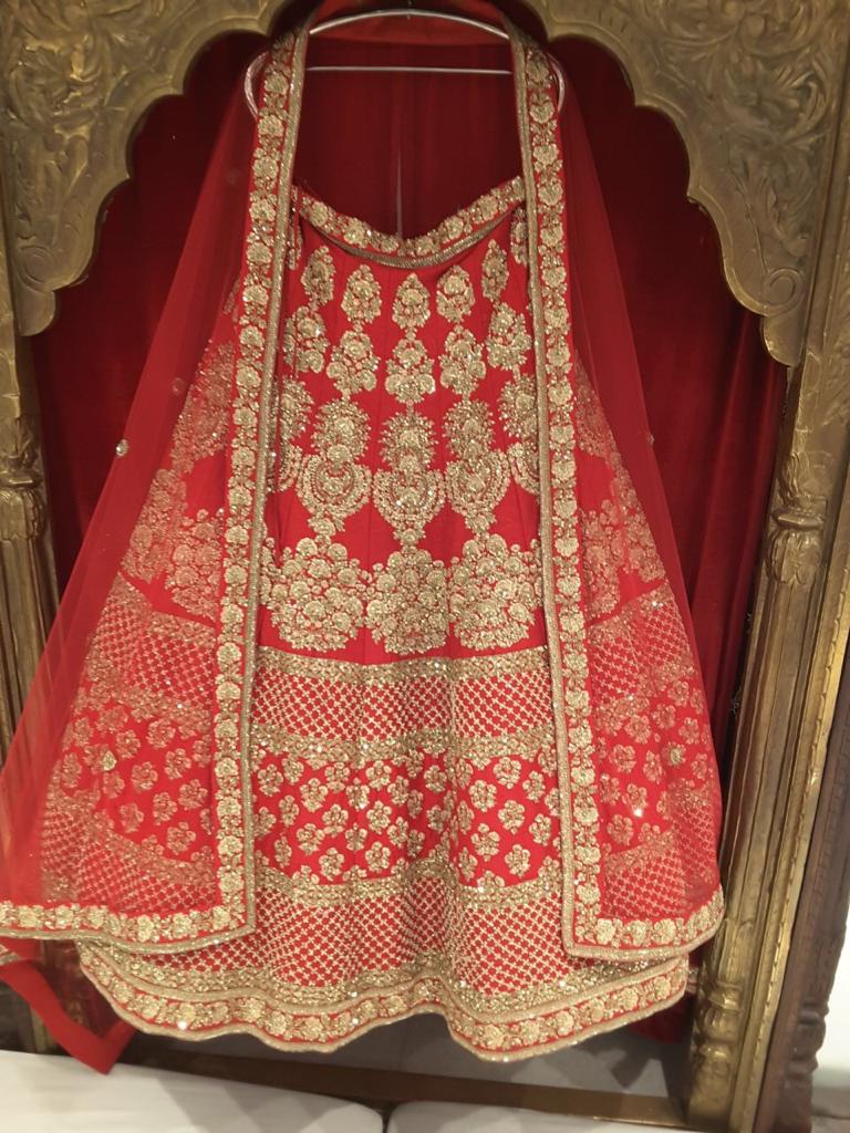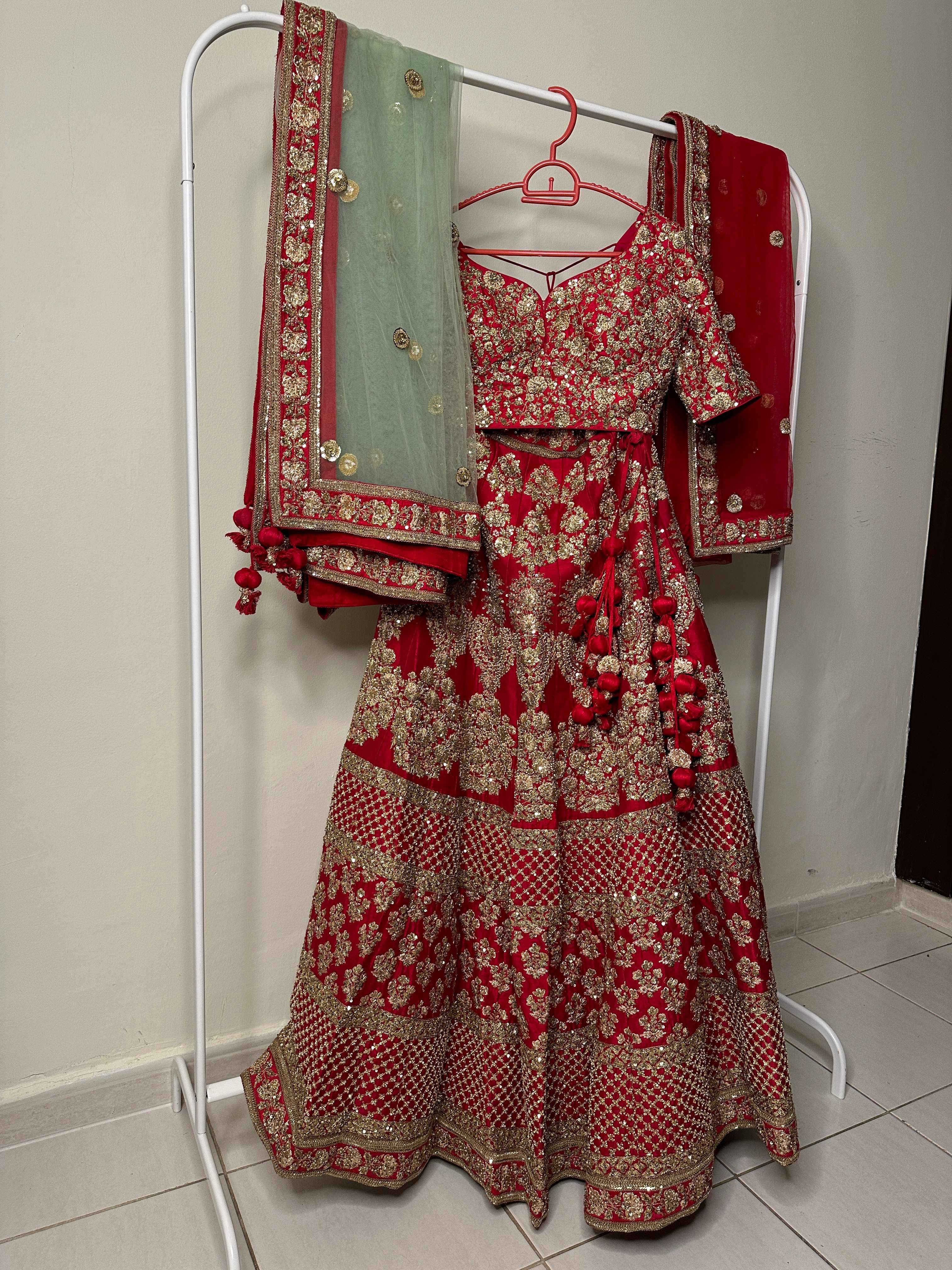 A beautiful, red Indian bridal lehenga made from pure dupion fabric and decorated with intricate Zardozi handwork and golden thread embroidery, will make you a standout at your wedding celebrations. The set comes with two dupattas to complete your look.