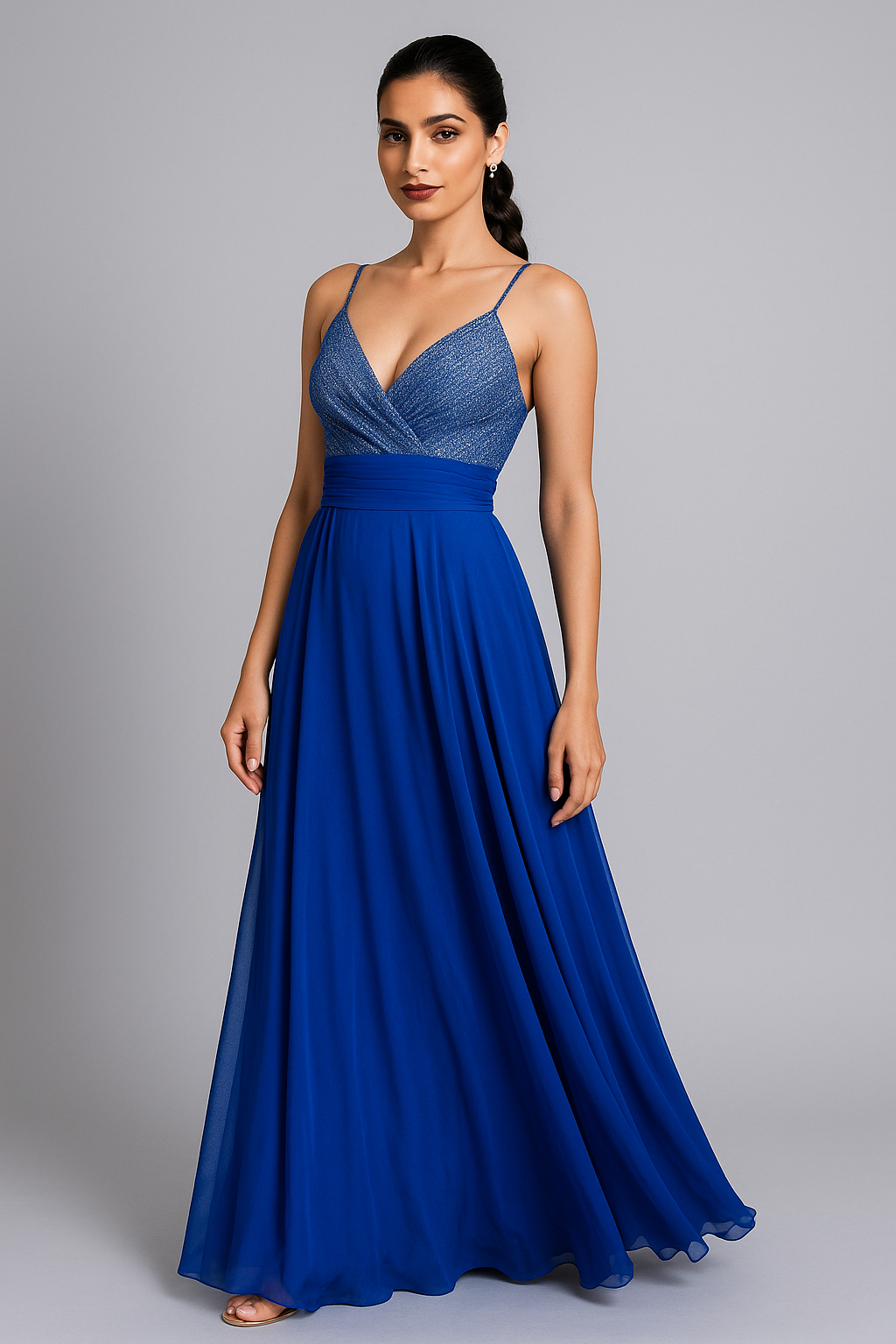 Look stunning in this gorgeous evening gown featuring chiffon fabric and a glitter-filled plunge neckline, finished by...