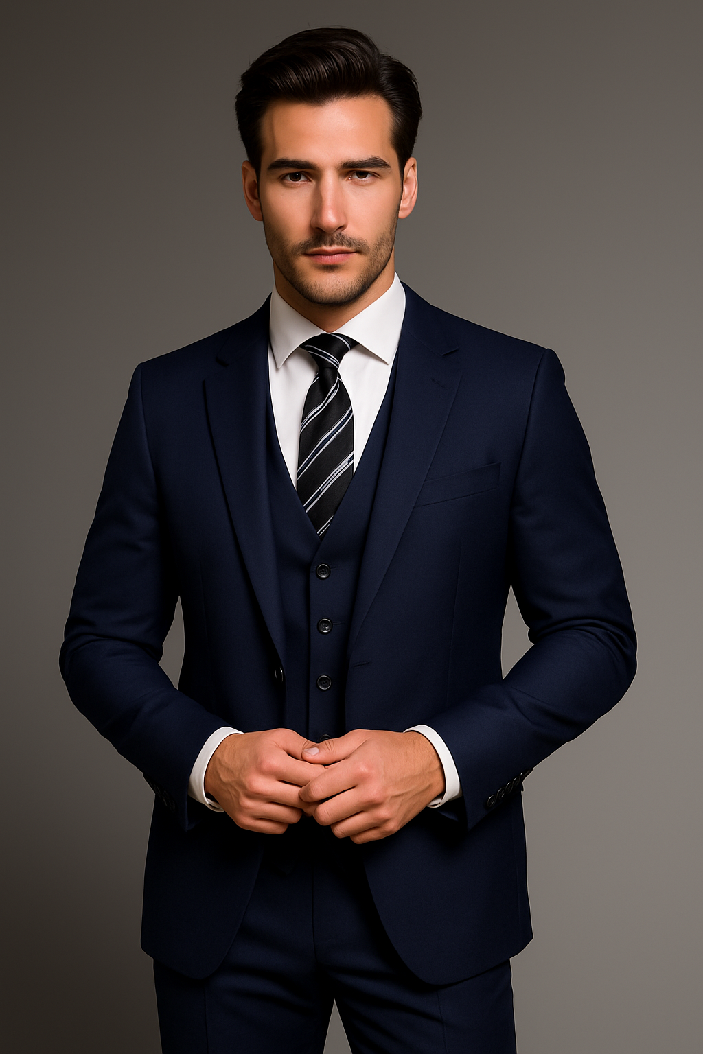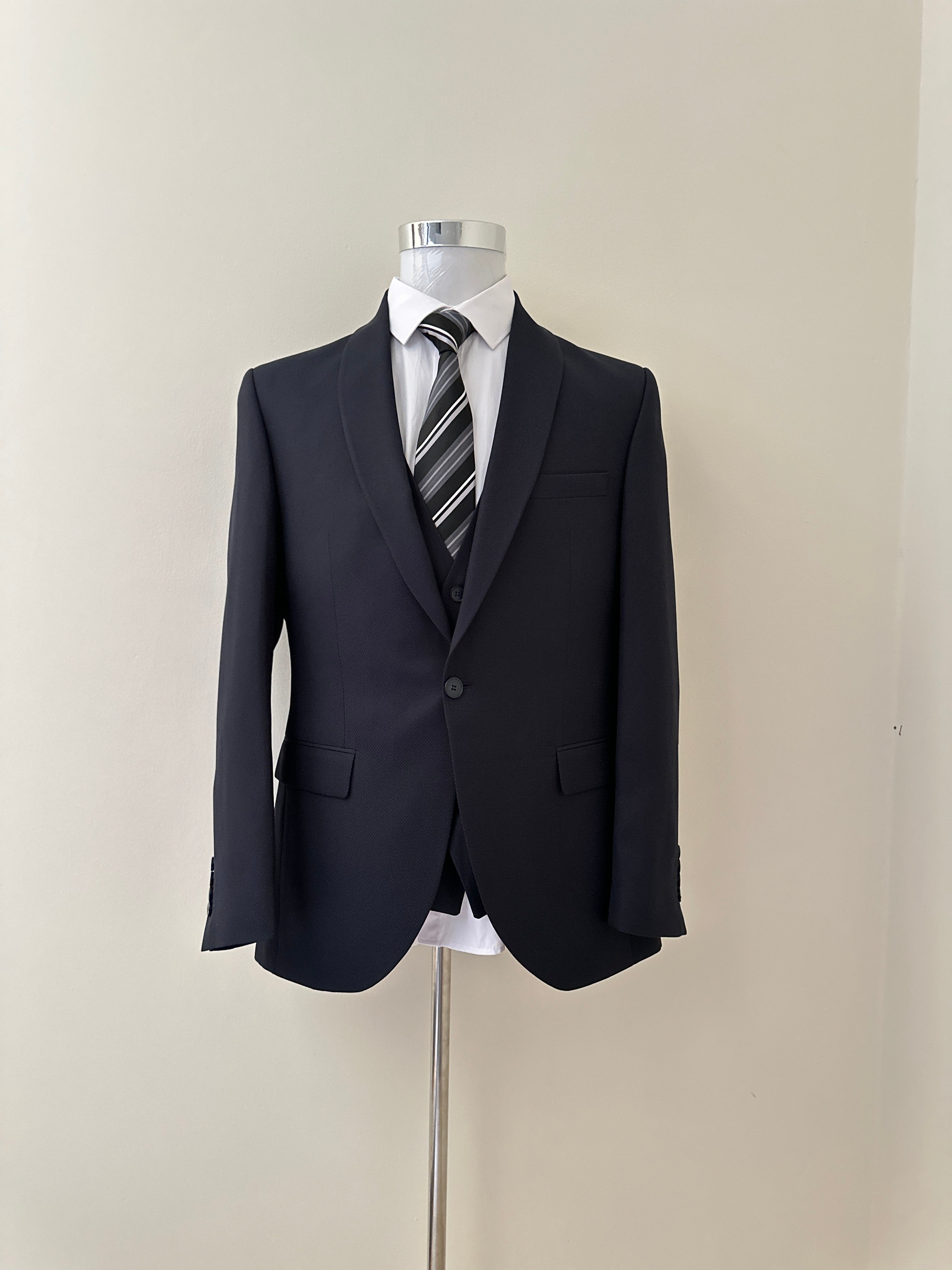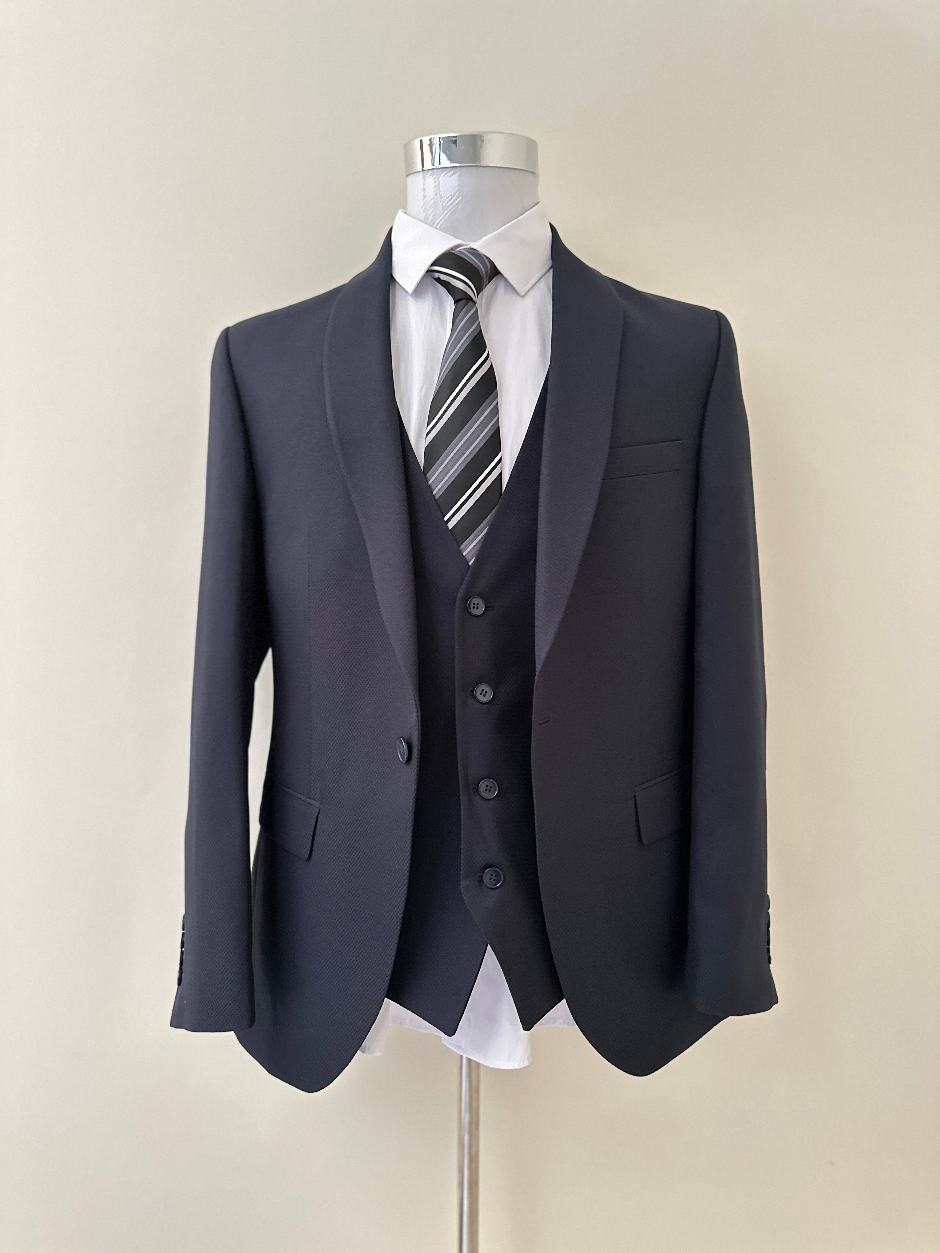 Elevate your professional presence with this three-piece dark blue men’s suit. Crafted for a sharp, confident look, it features a tailored fit that enhances your silhouette, perfect for boardrooms, meetings, or special occasions. The rich dark blue color adds sophistication and versatility to your wardrobe, ensuring you stand out with style and confidence. Step into success with a suit designed to impress and empower.