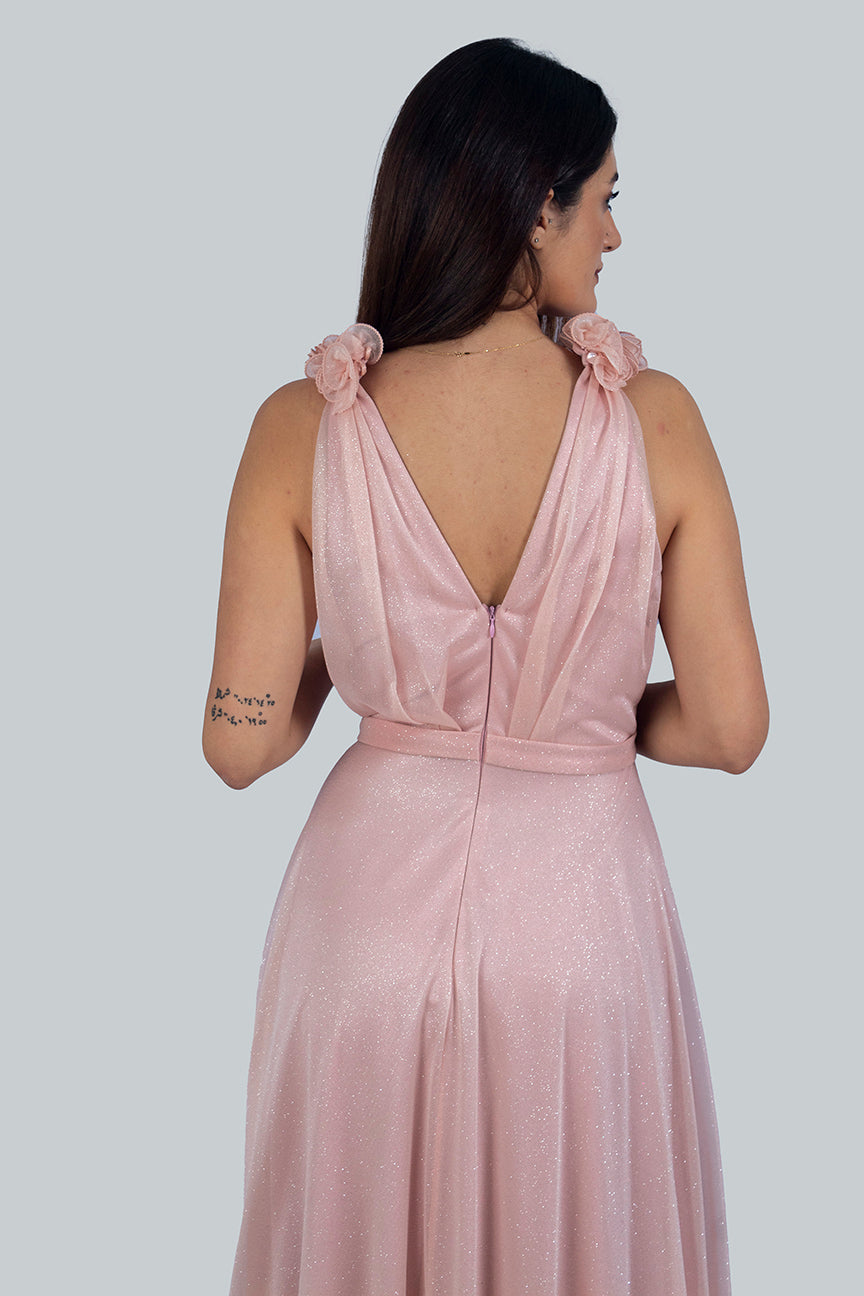 Make a statement in this glamorous flowy gown. Enchanting shimmery fabric catches the light with every move, showing your stunning silhouette in all its glory. Step into the spotlight and feel beautiful!