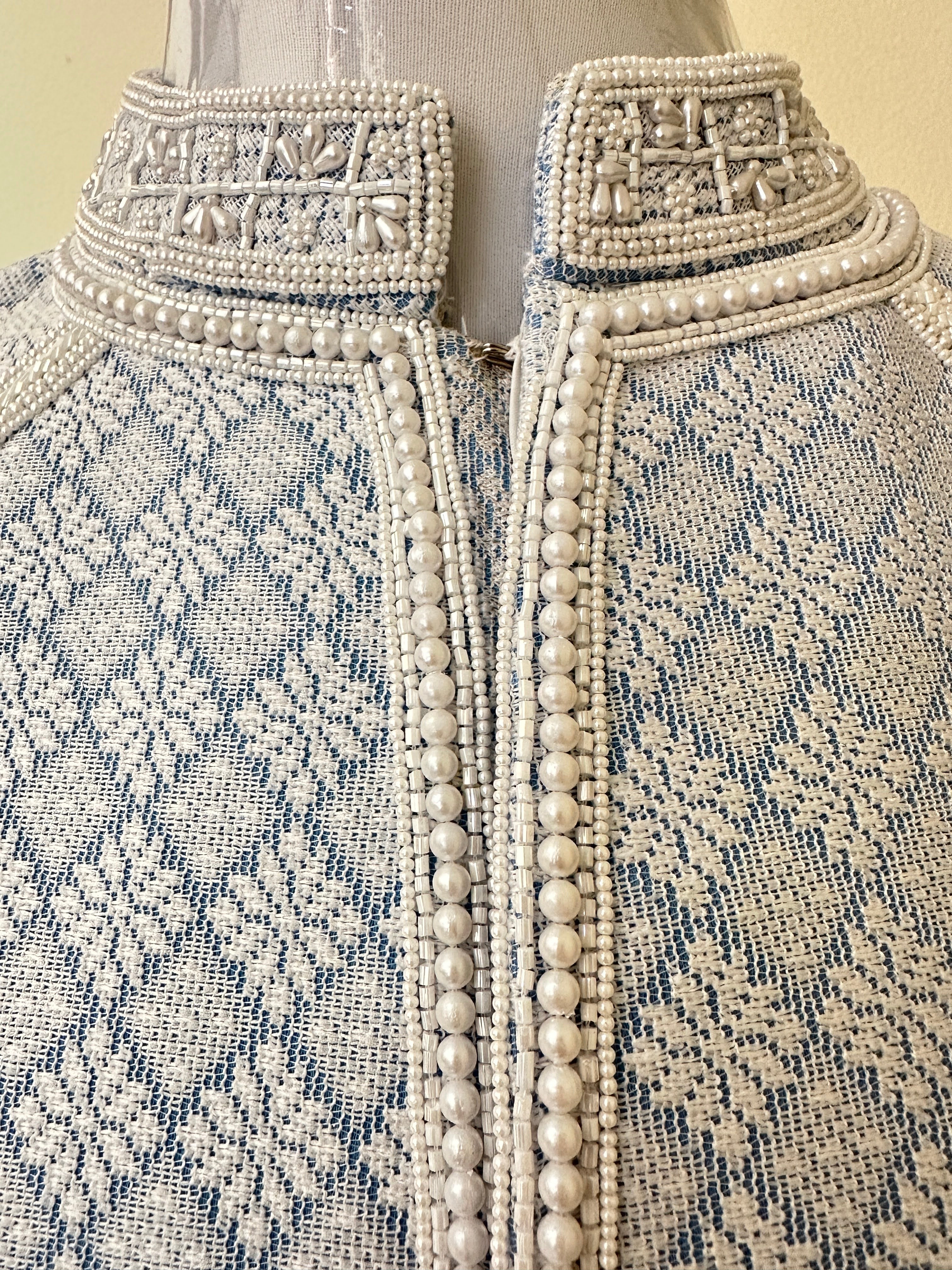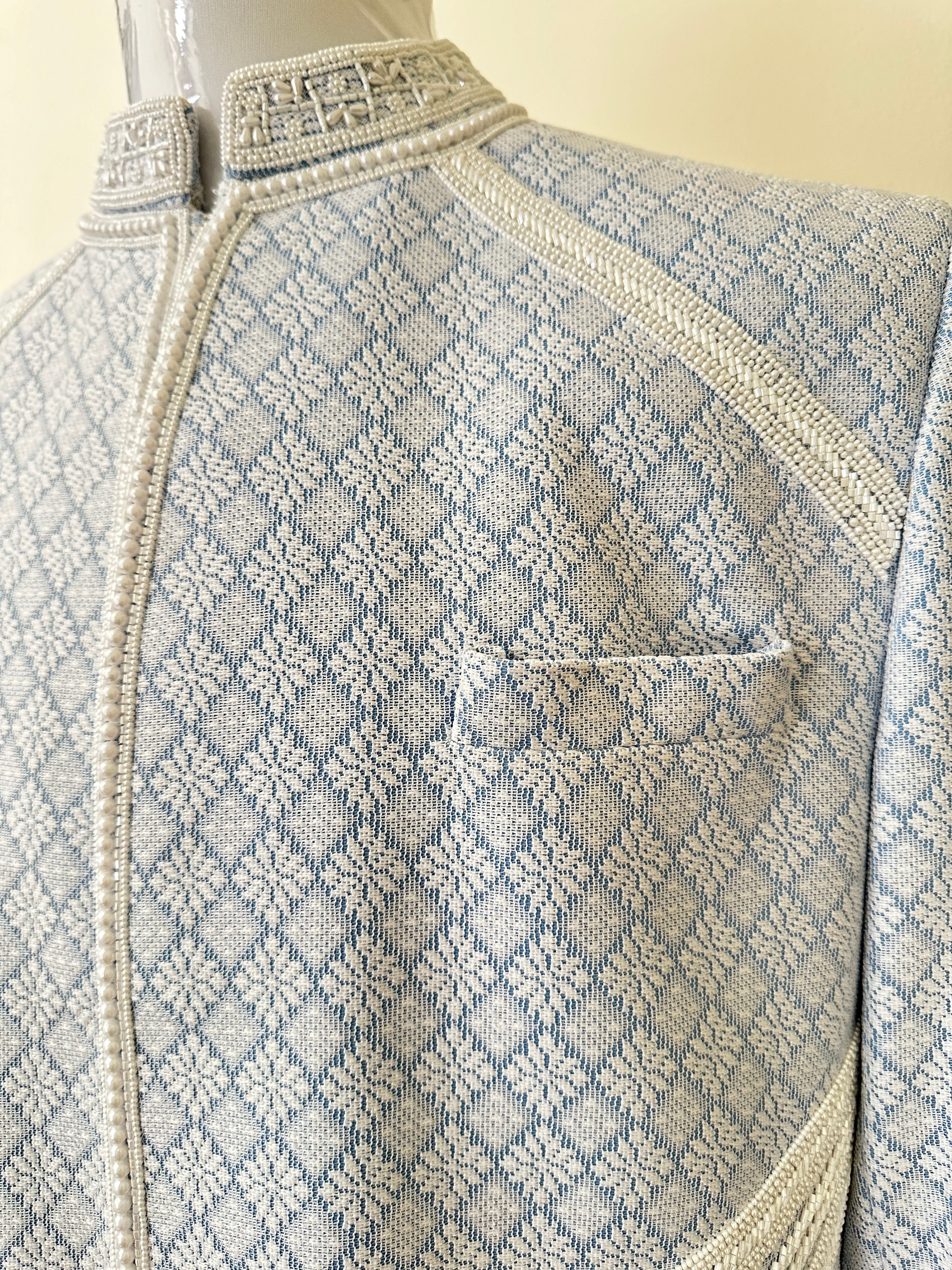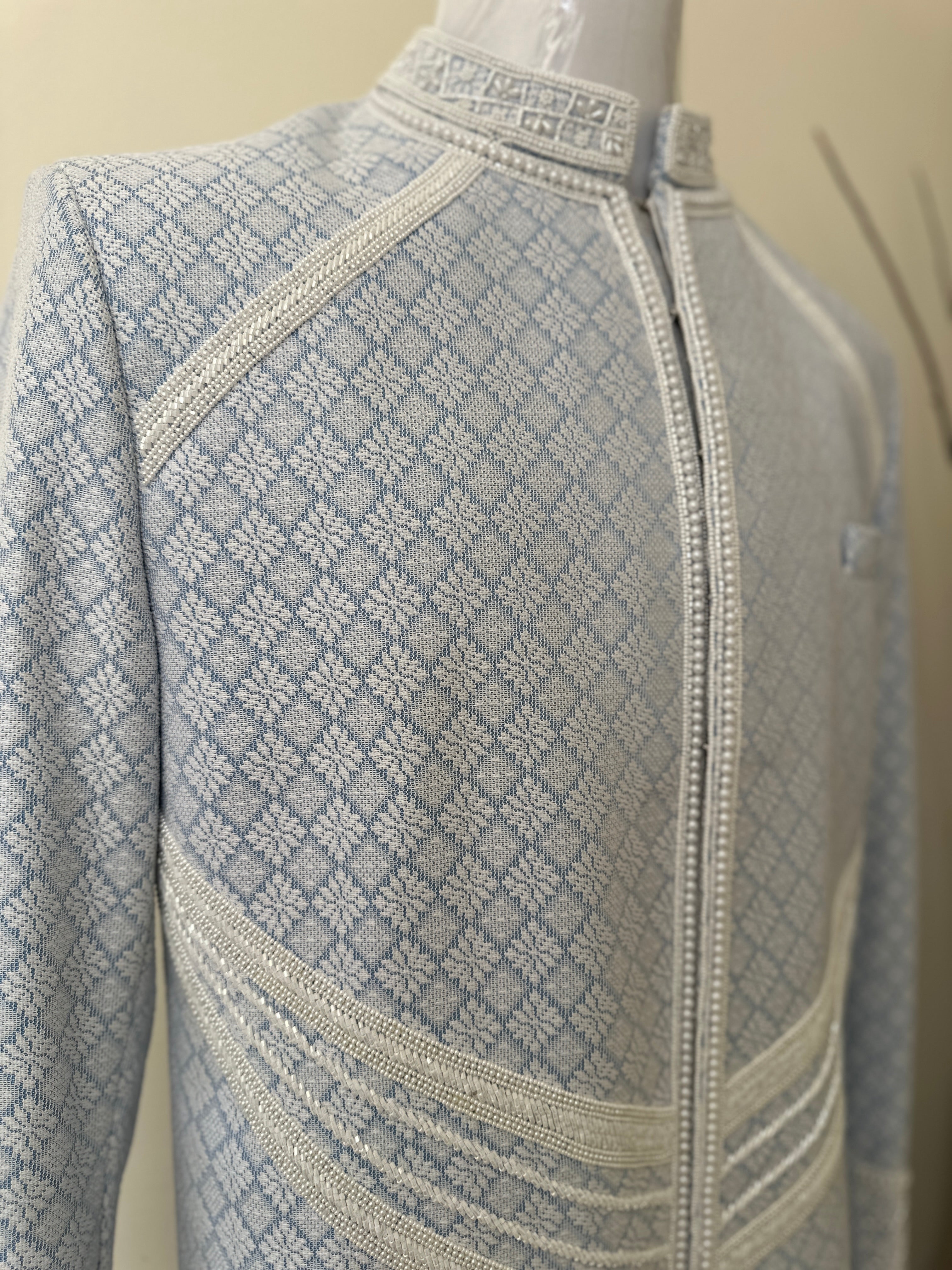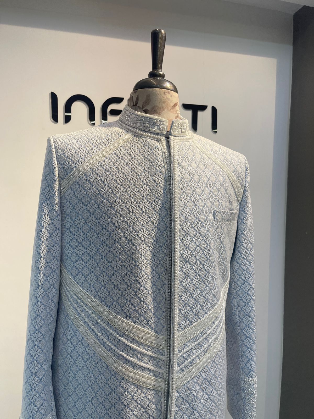 Experience a touch of elegance with our Groom Sherwani collection. Made with intricate white thread and pearl work, this sherwani in the coolest shade of blue exudes beauty and sophistication. Make a lasting impression on your special day with this timeless piece.