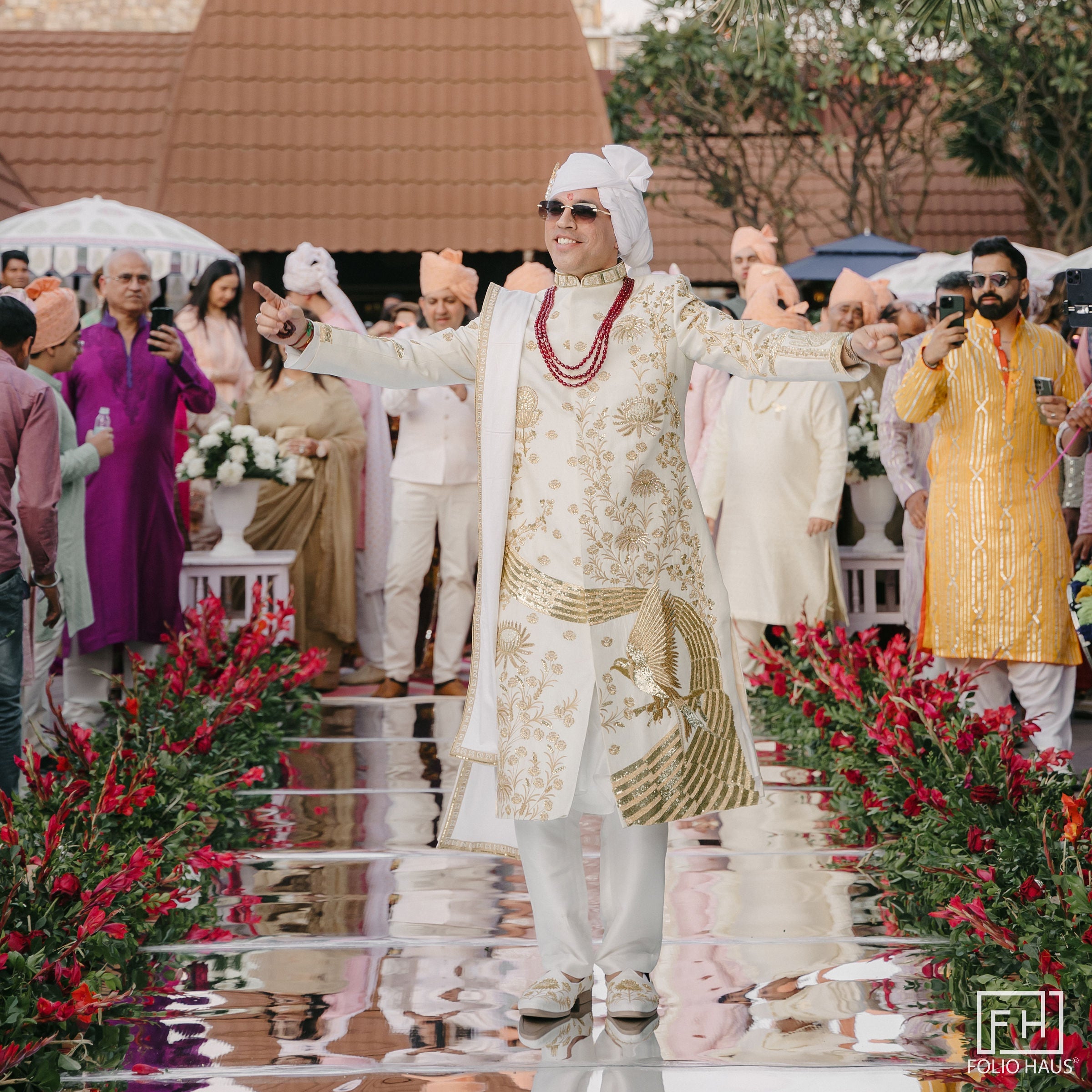 Designed by renowned Indian fashion designer Masaba, this groom sherwani exudes elegance and luxury. Made with pure silk fabric and adorned with hand sequin and thread work, it's the perfect choice for a stylish and unforgettable wedding. Elevate your groom look with this statement piece!