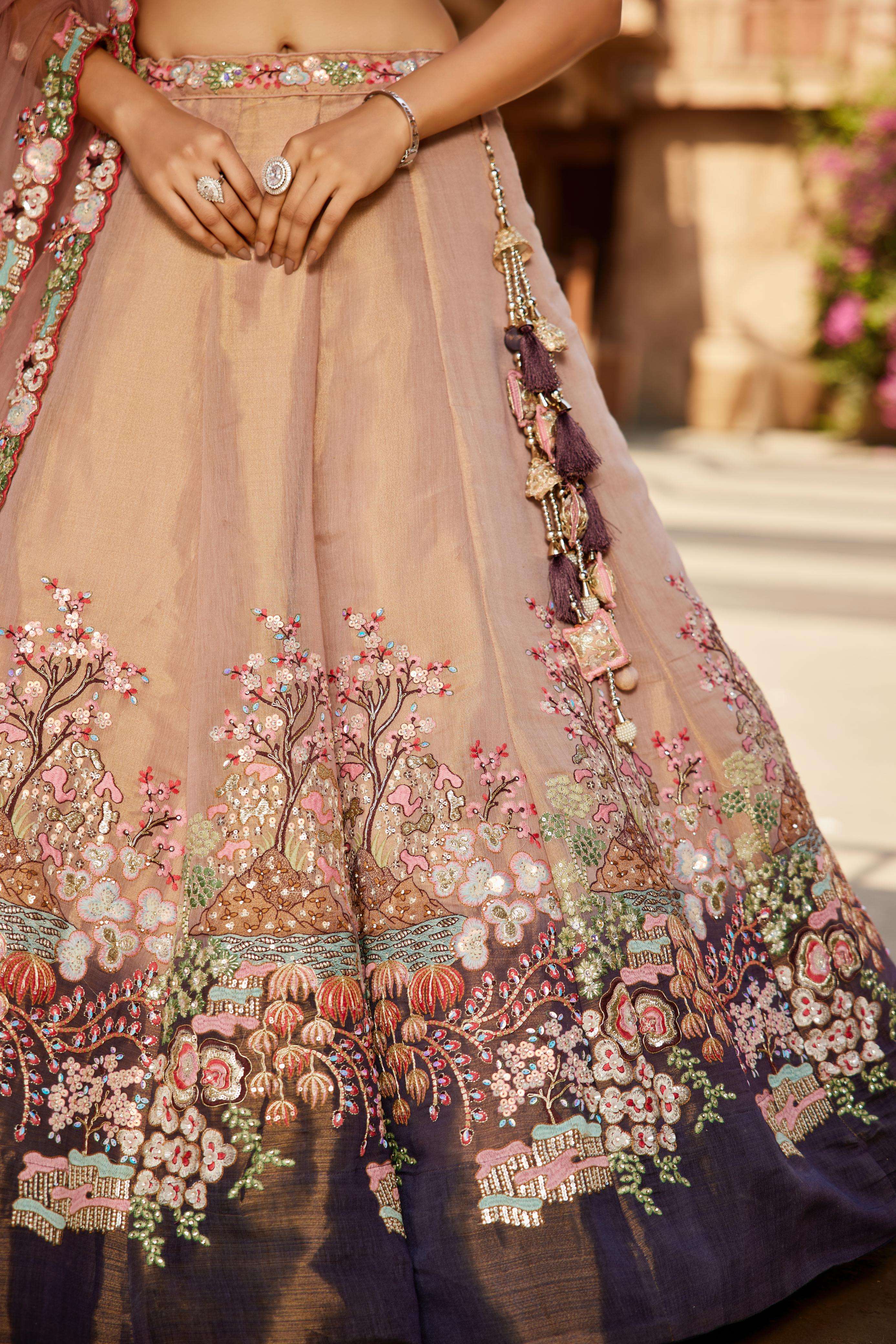 Elevate your style with this exquisite two-tone purple and cream bridal net fabric, crafted from premium-quality net. Featuring intricate zarkans, sequins, and delicate thread embroidery, this fabric brings a luxurious shimmer and textured elegance to any ensemble, making it perfect for standout occasions. Its rich design ensures you shine with confidence and grace.