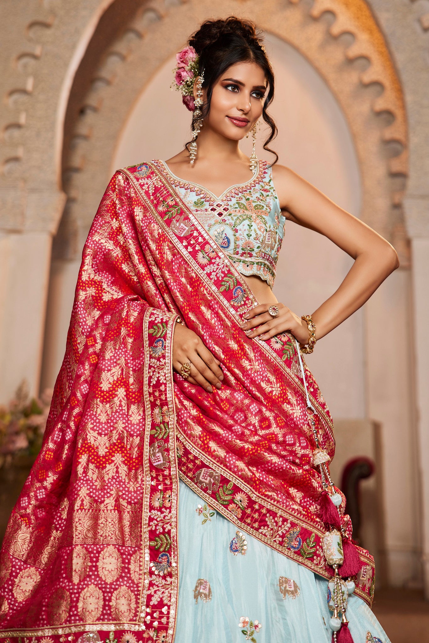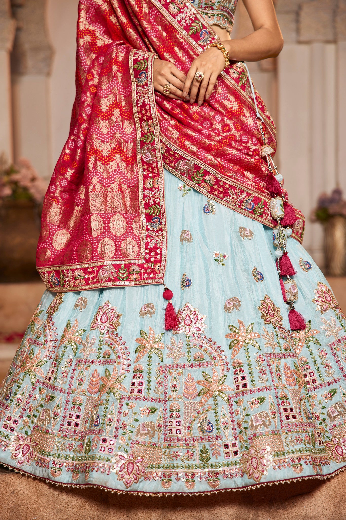This exquisite garment crafted from premium peach-colored tissue fabric showcases intricate mirror, moti, sequin, and coding embroidery, elevating its elegance. Detailed thread embroidery adds depth, while the moti border on the hemline offers a refined finishing touch, making it a standout piece perfect for special occasions.
