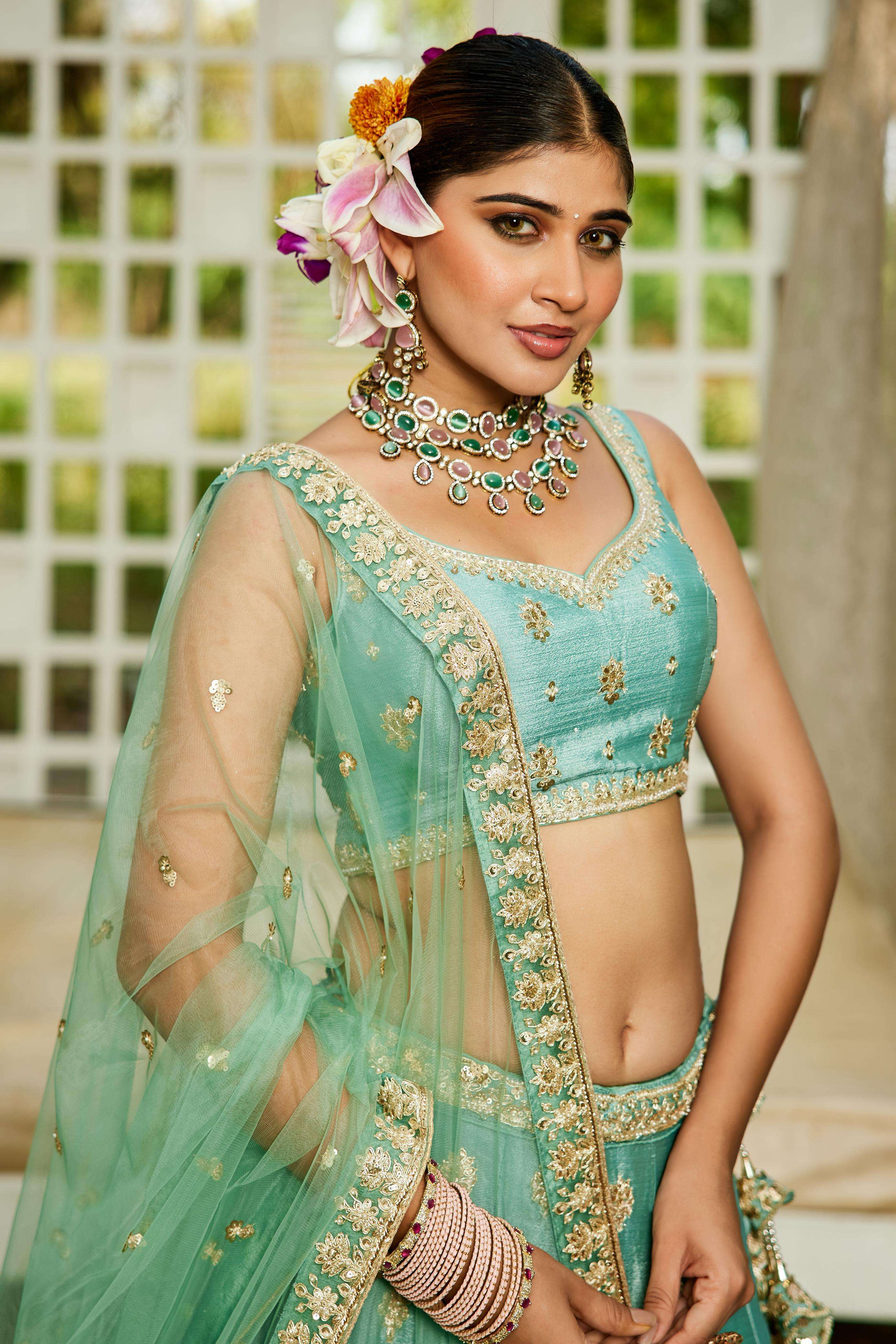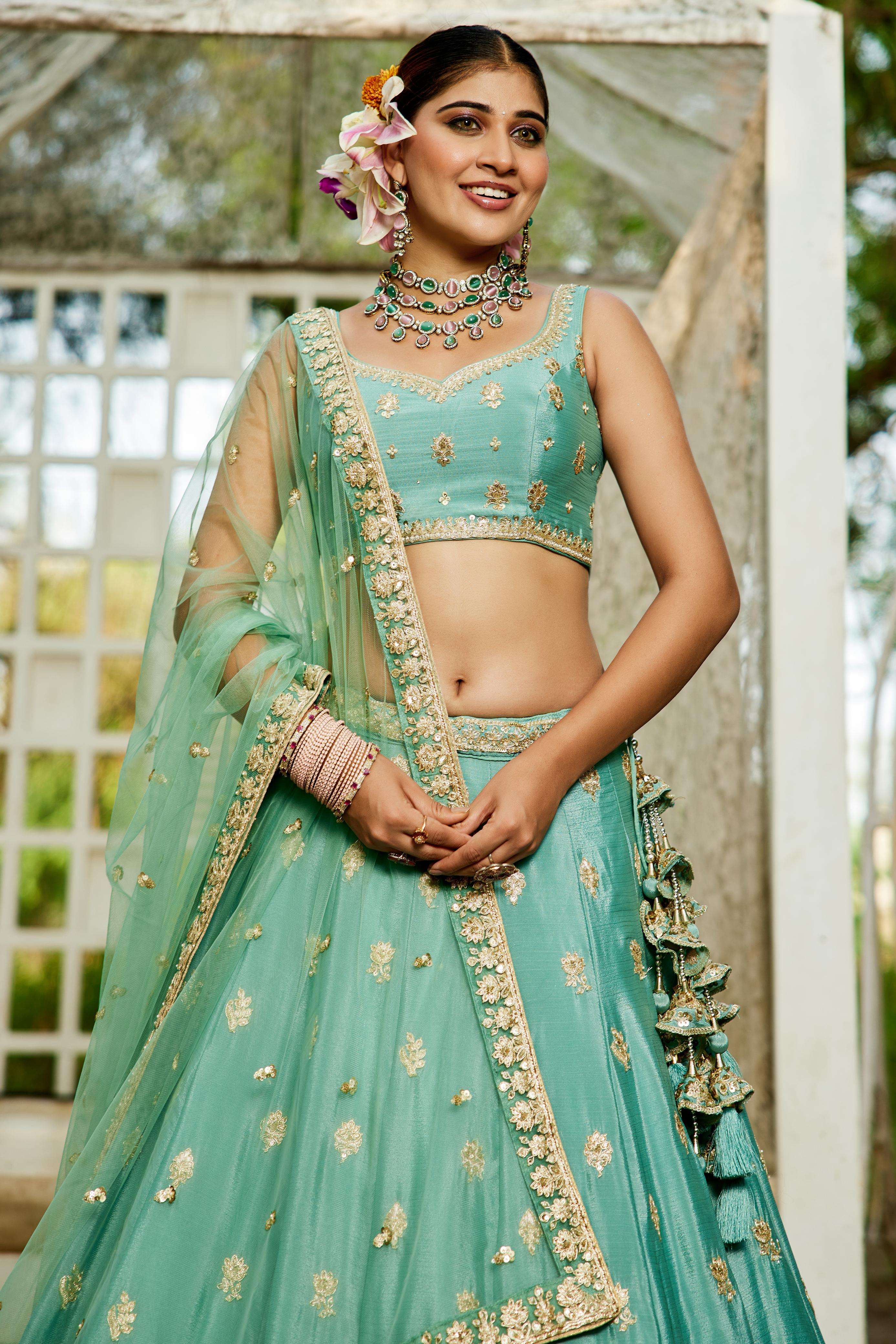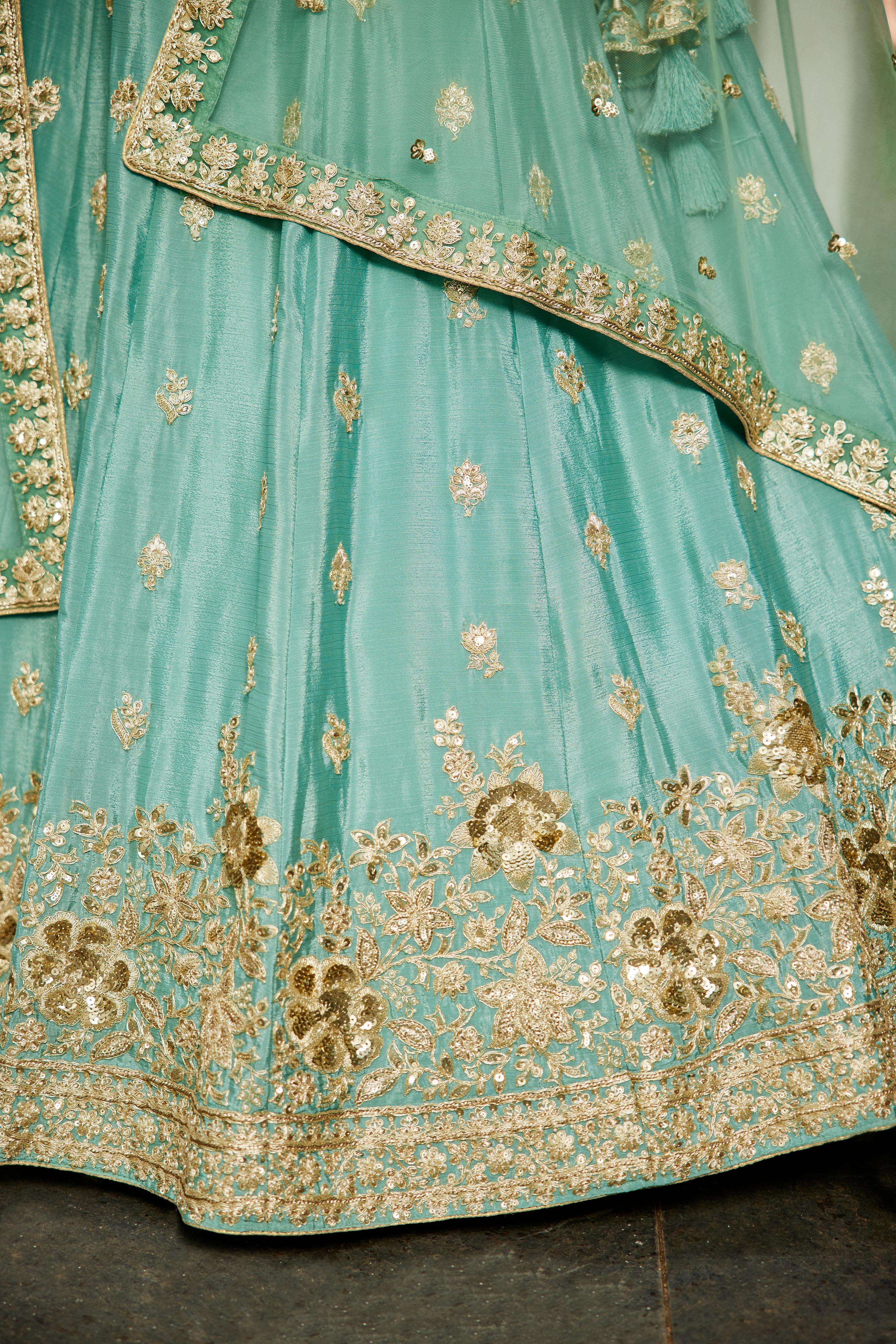 Crafted from premium chiffon in a soothing mint blue-green shade, this exquisite piece features delicate sequin embroidery detailed with fine threadwork. The intricate sequin and coding design enhances its elegance, while the thread-embroidered border along the hemline adds a refined finishing touch. Perfect for those seeking grace and sophistication in every detail.