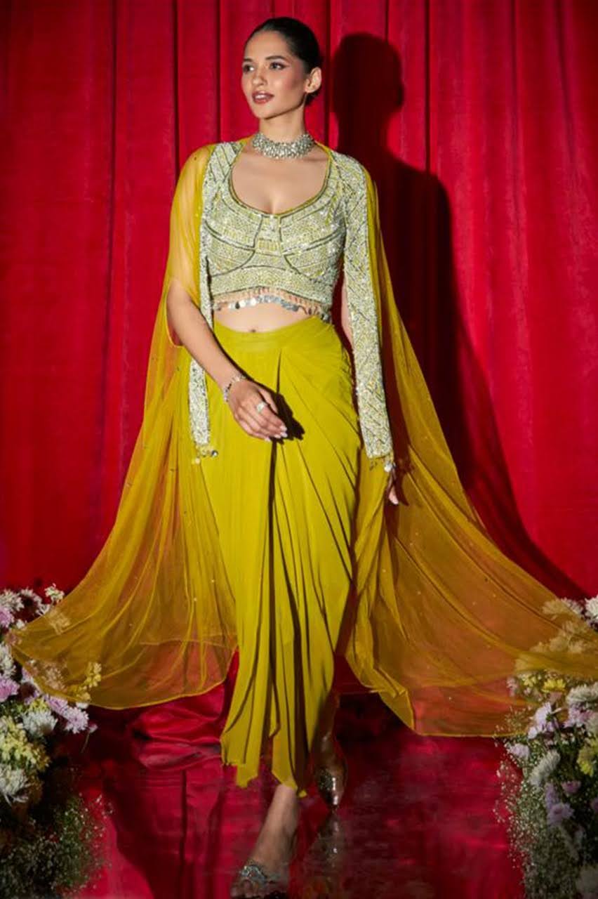 RYW-IND-W0001 Elevate your style with our Indowestern Cape Set! This stylish set features a stunning yellow cape with intricate handworked details and a flowy net cape for added elegance. Feel confident and make a statement with this must-have piece.
