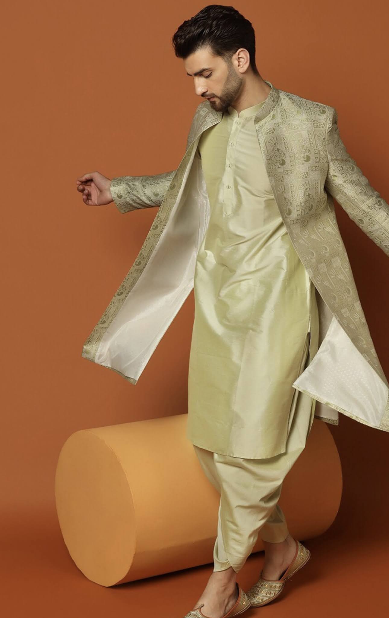 RYW-IND-M0011 Stunning and unique, our Self Design Indowestern Sherwani Set is sure to make you stand out from the crowd. With its intricate self design and traditional Indowestern style, this set is perfect for any special occasion. Add a touch of elegance and sophistication to your wardrobe with our Sherwani set.