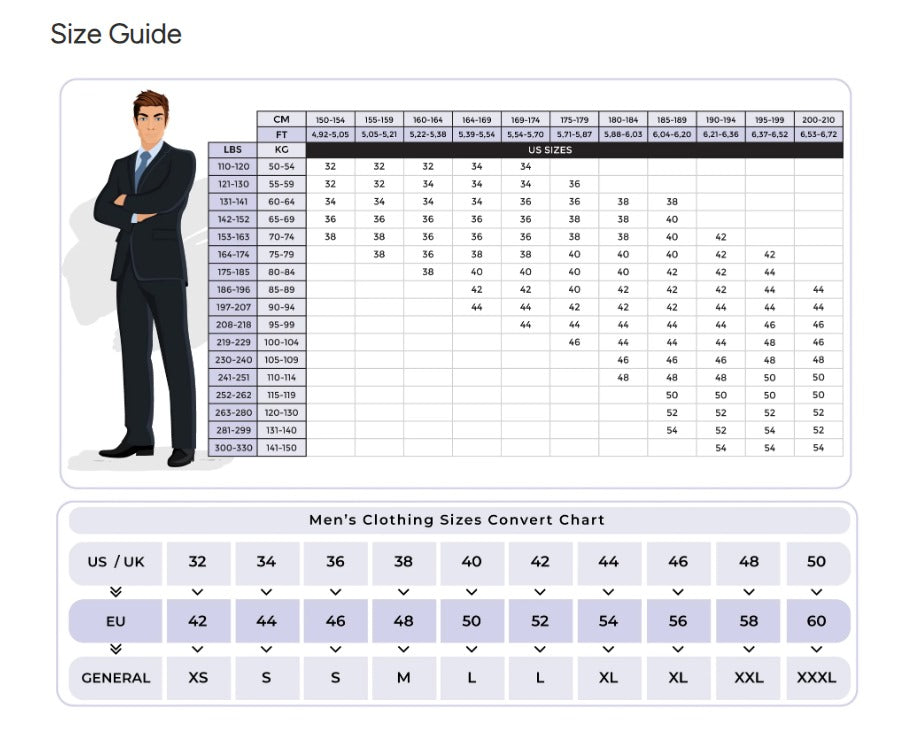 | EU | 34 | 36 | 38 | 40 | 42 | 44 | 46 | 48 | 50 | 52 | 54 |