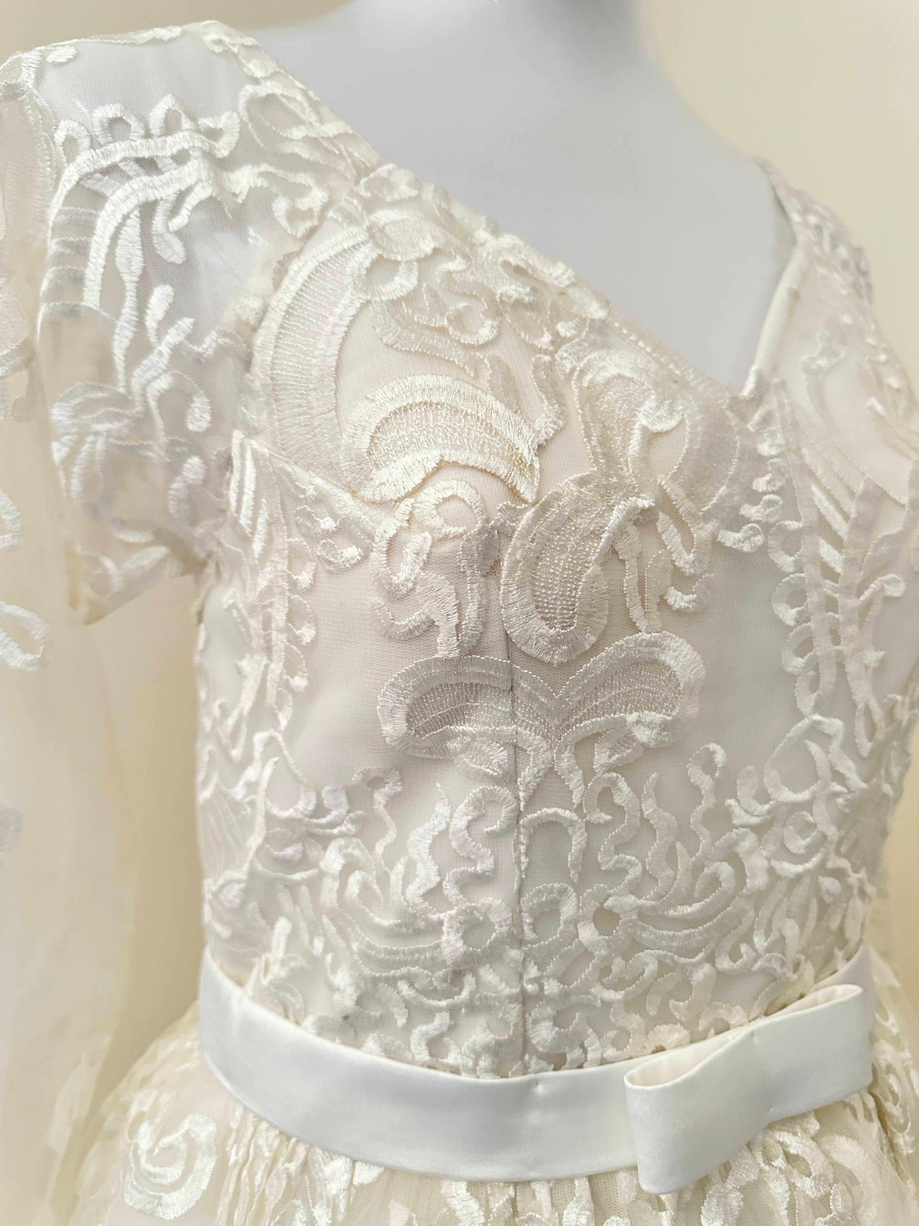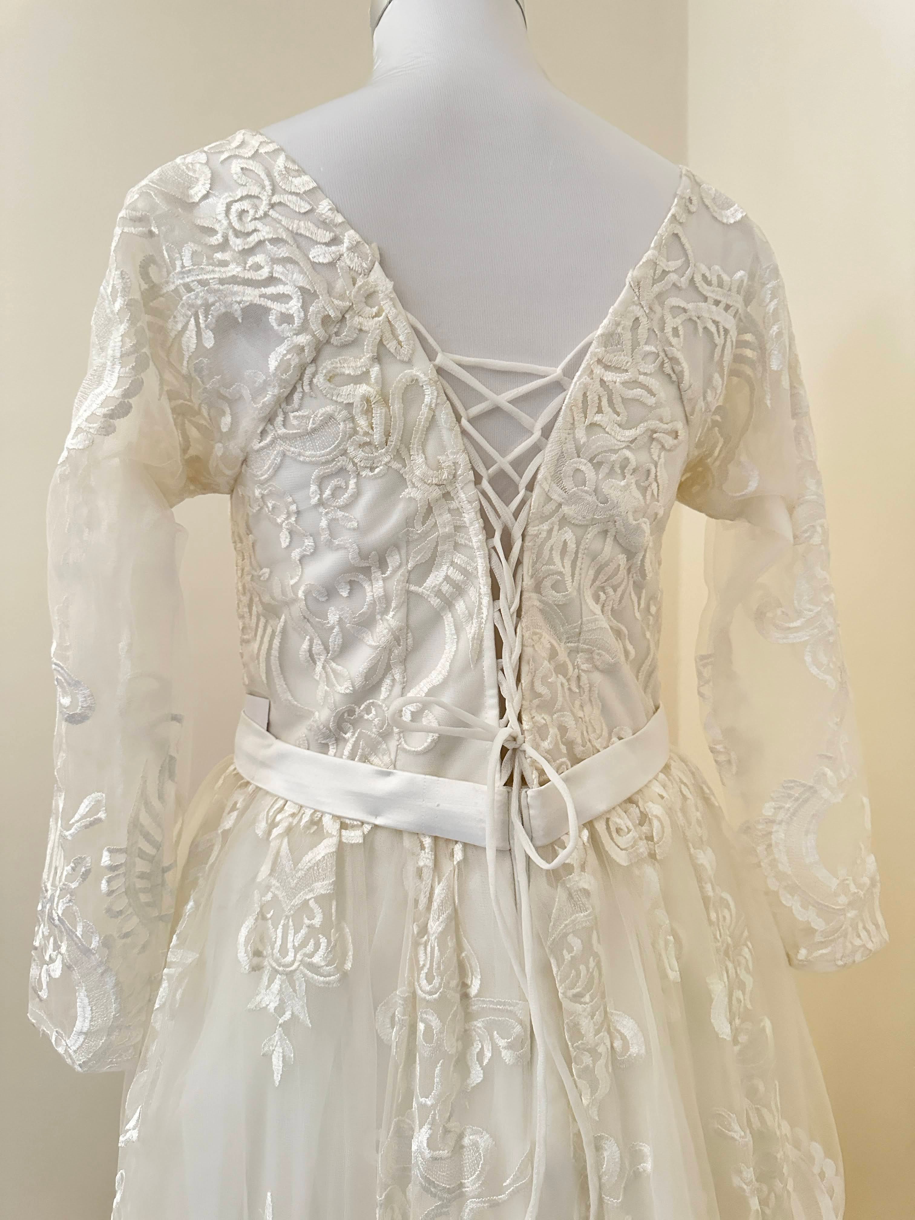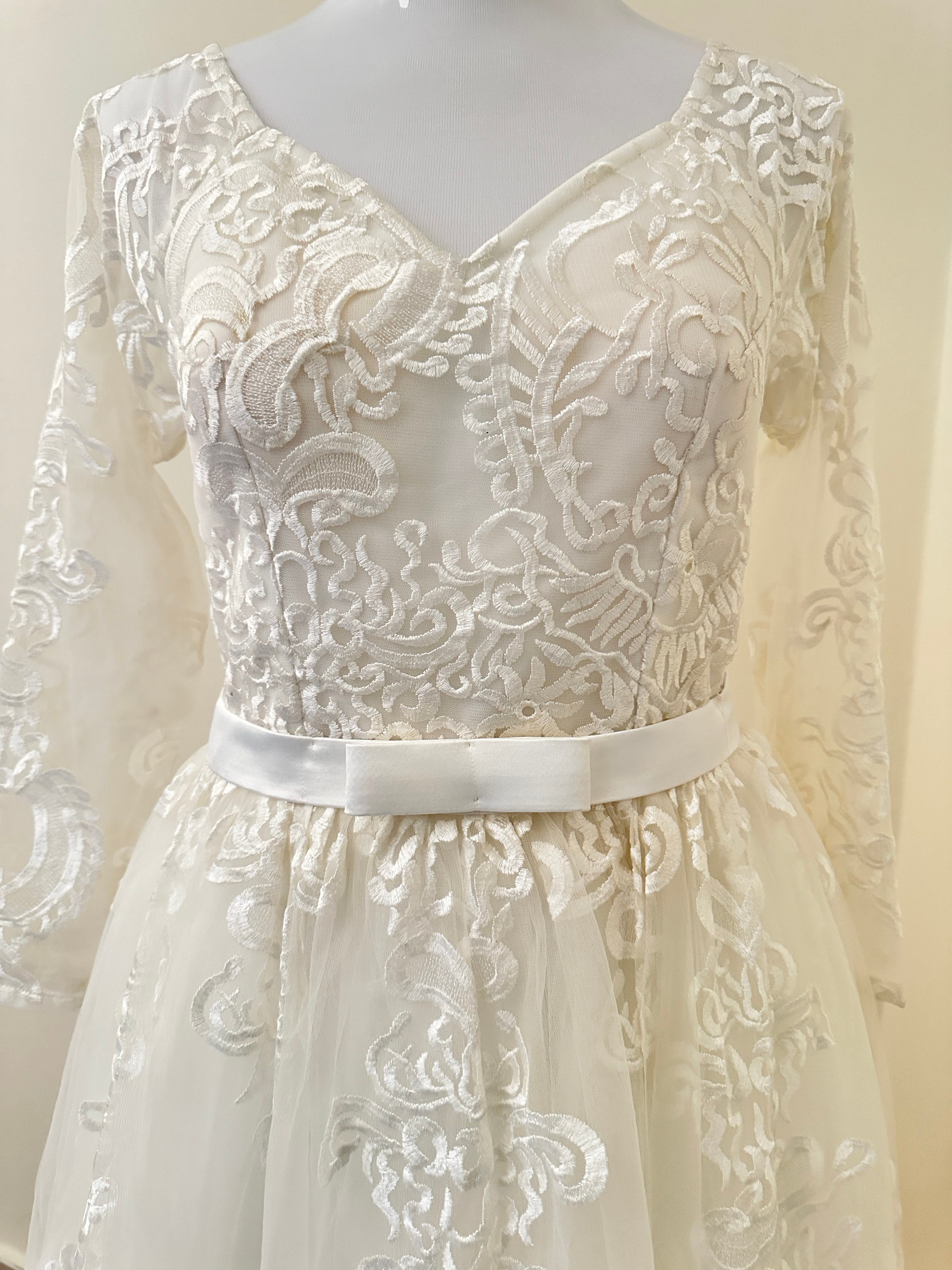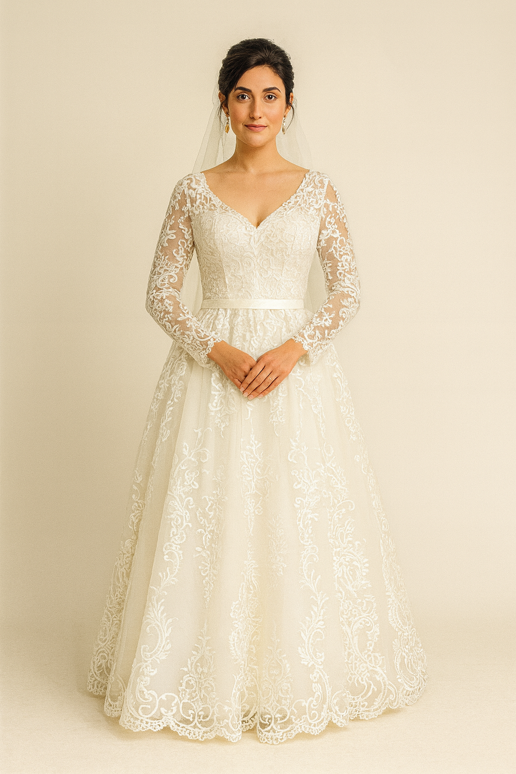 Fall in love with our Bridal Gown RYWVAN5! Made with soft tulle fabric, intricate embroidery, and full sleeves, this gown will make you feel like a princess on your special day. The corset back ensures a perfect fit, while the long veil adds a touch of elegance. Make your dream wedding a reality with this stunning gown.