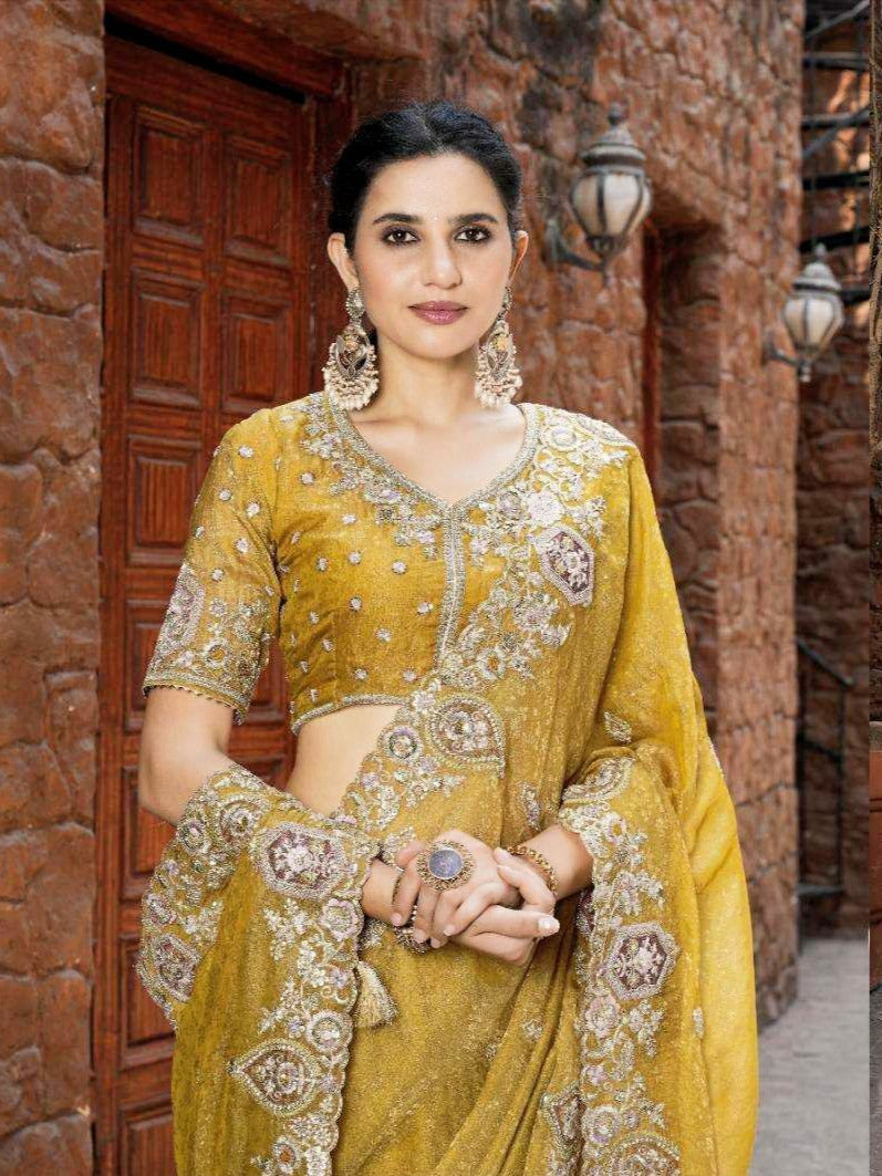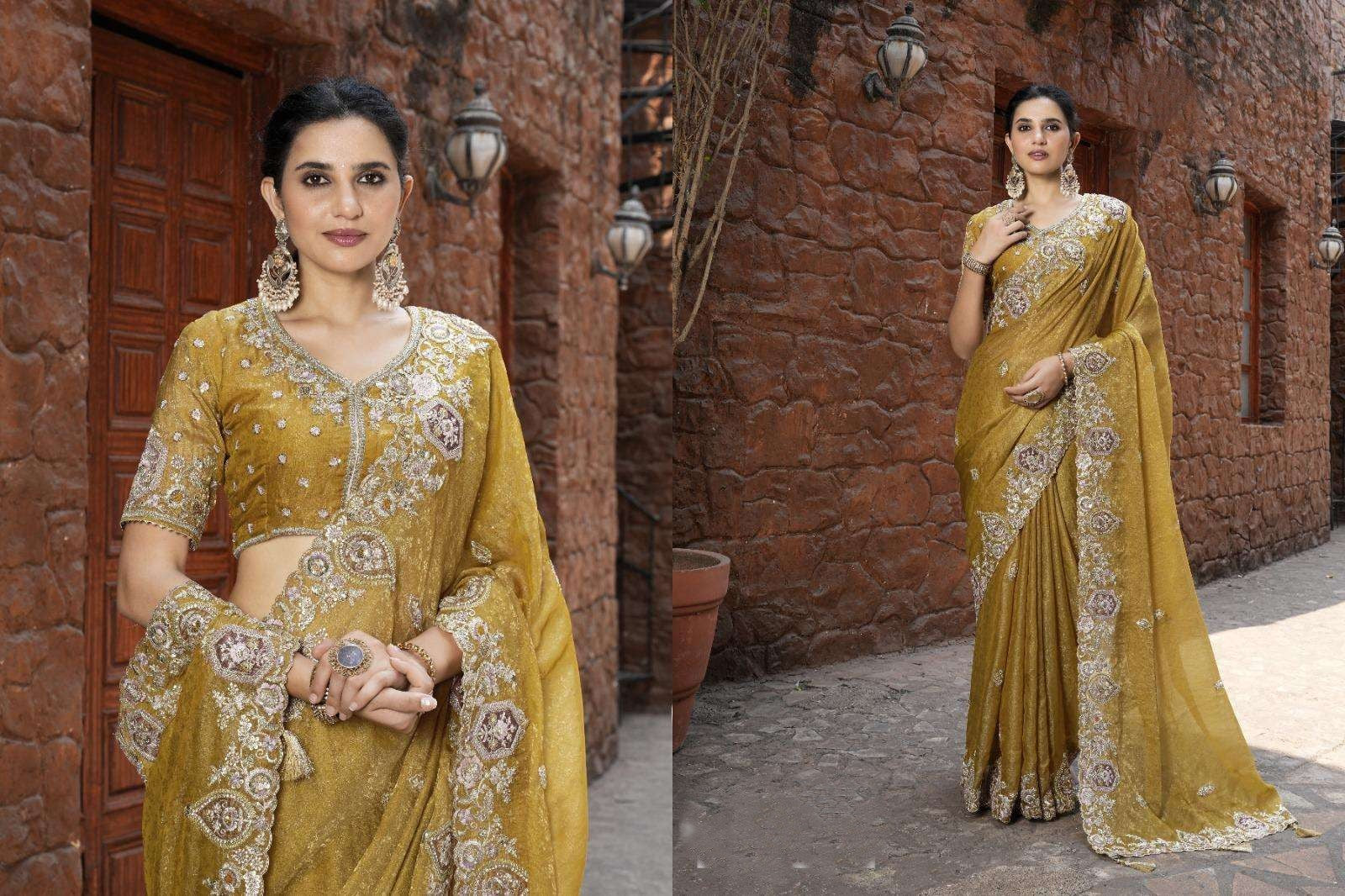 Elevate your occasion with this exquisite Tissue Saree, crafted from pure fancy fabric. Adorned with intricate embroidery, shimmering stones, and delicate pearls, its handwork border adds a luxurious touch perfect for weddings and festive gatherings. Experience elegance and tradition woven seamlessly to make every moment unforgettable.