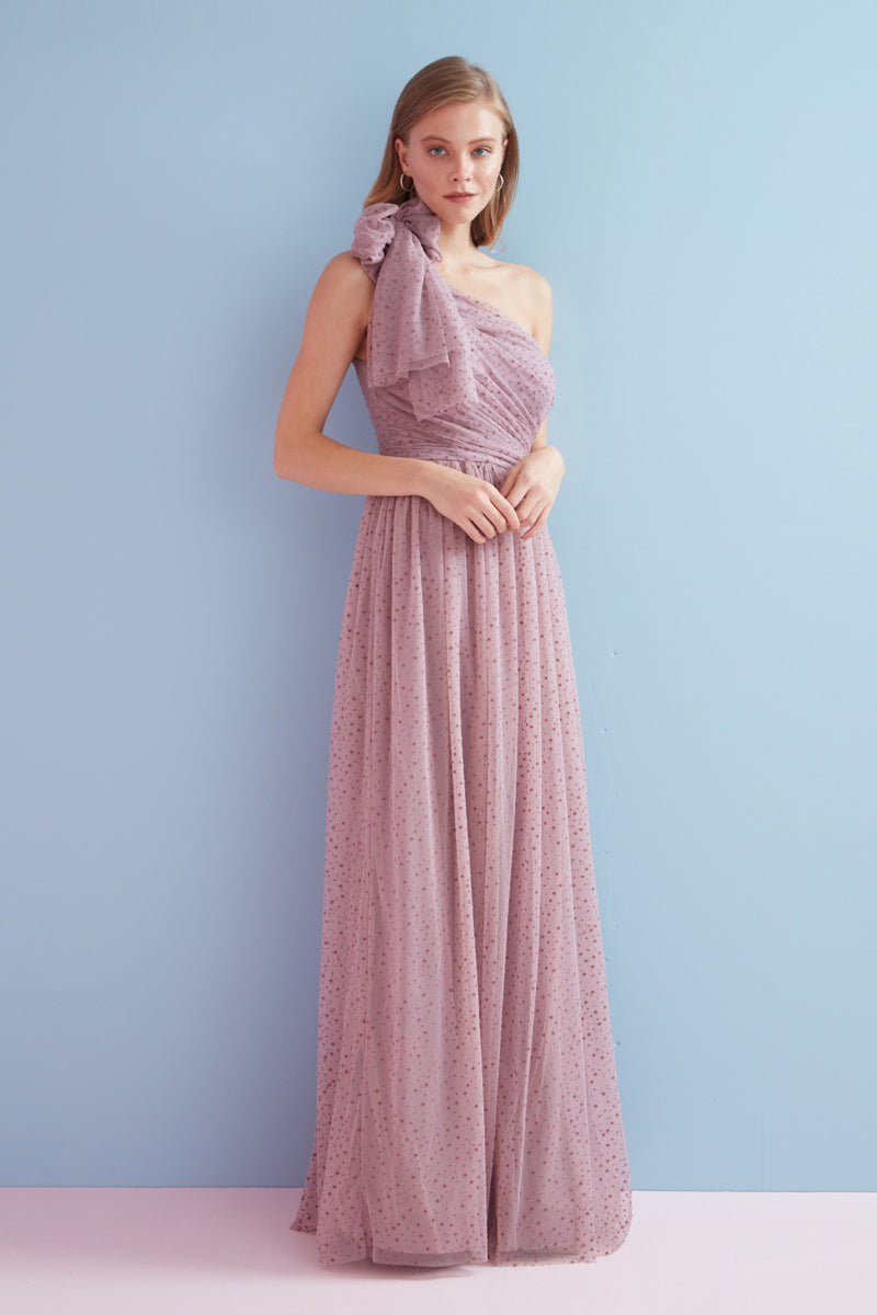 This single-shoulder maxi dress is crafted from tulle fabric, making it lightweight and comfortable for all-day wear. The special bow on one shoulder adds a chic touch, and the pastel color creates a flattering look. Perfect for a special occasion or a night out on the town.