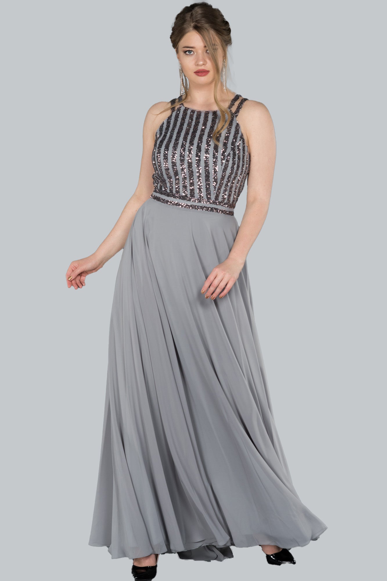 This Evening Maxi dress is a graceful choice for any occasion. Made of ash grey fabric with beautiful sequin work on the front and back neckline, it's a timeless and elegant look for any special event.