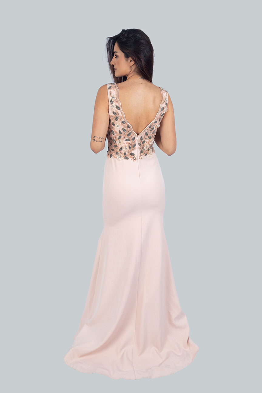 Look dazzling in this pastel evening gown. Featuring a maxi dress with elegant beadwork and embroidered sequins on the front, this gown also offers a bareback style for the perfect combination of sophistication and allure.