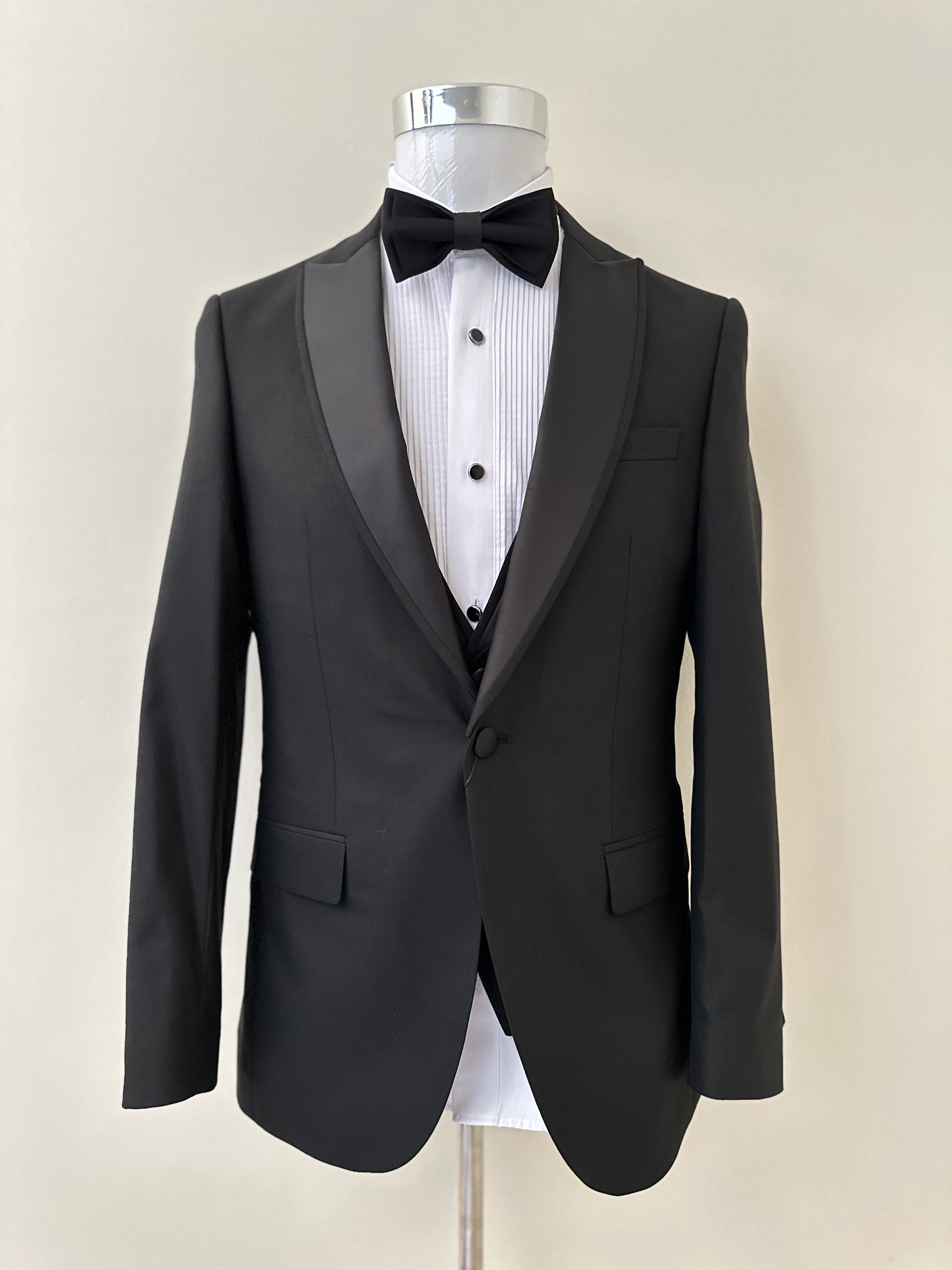 Elevate your formal wardrobe with this sophisticated tuxedo set featuring a striking peak satin lapel in classic...