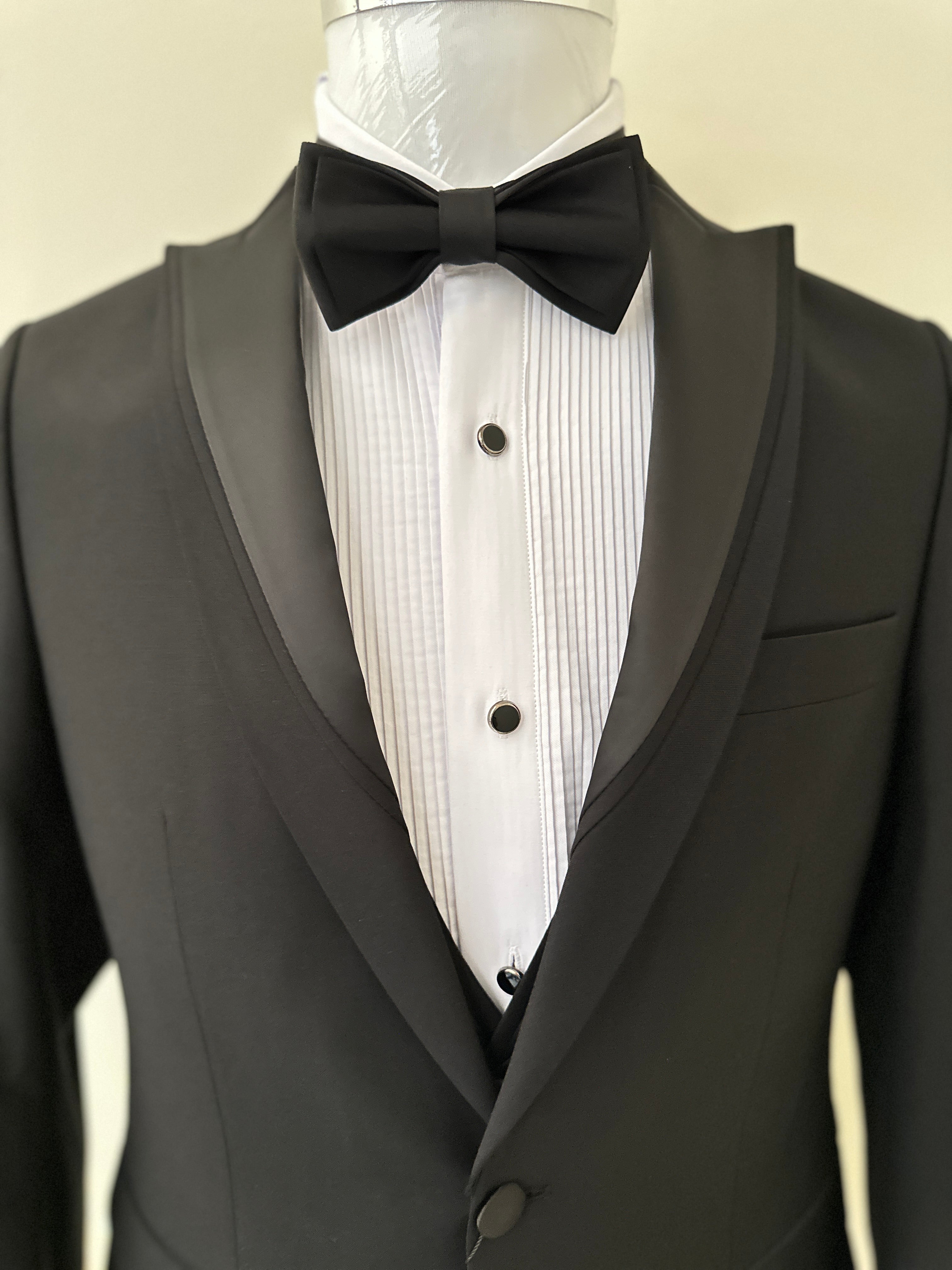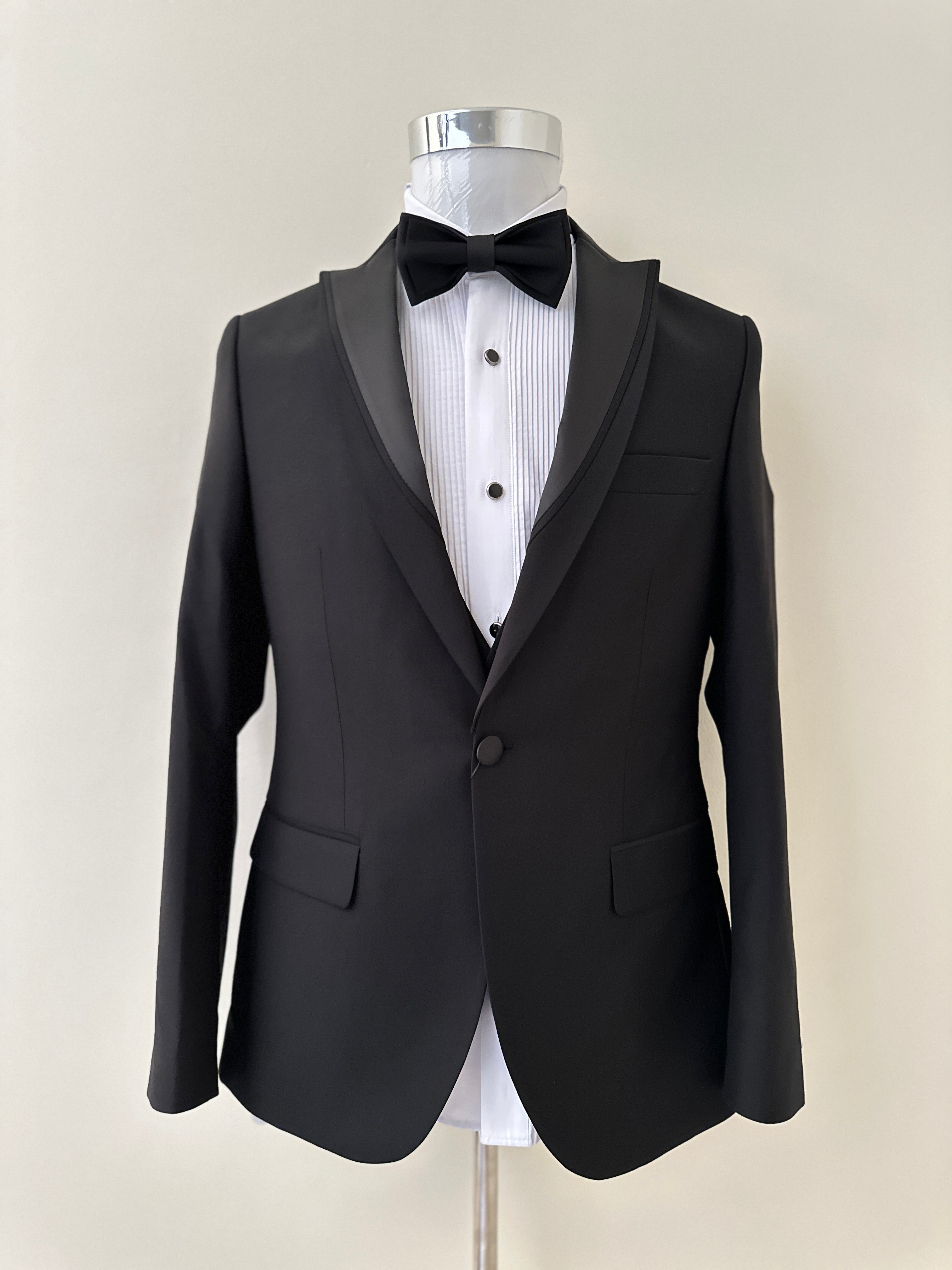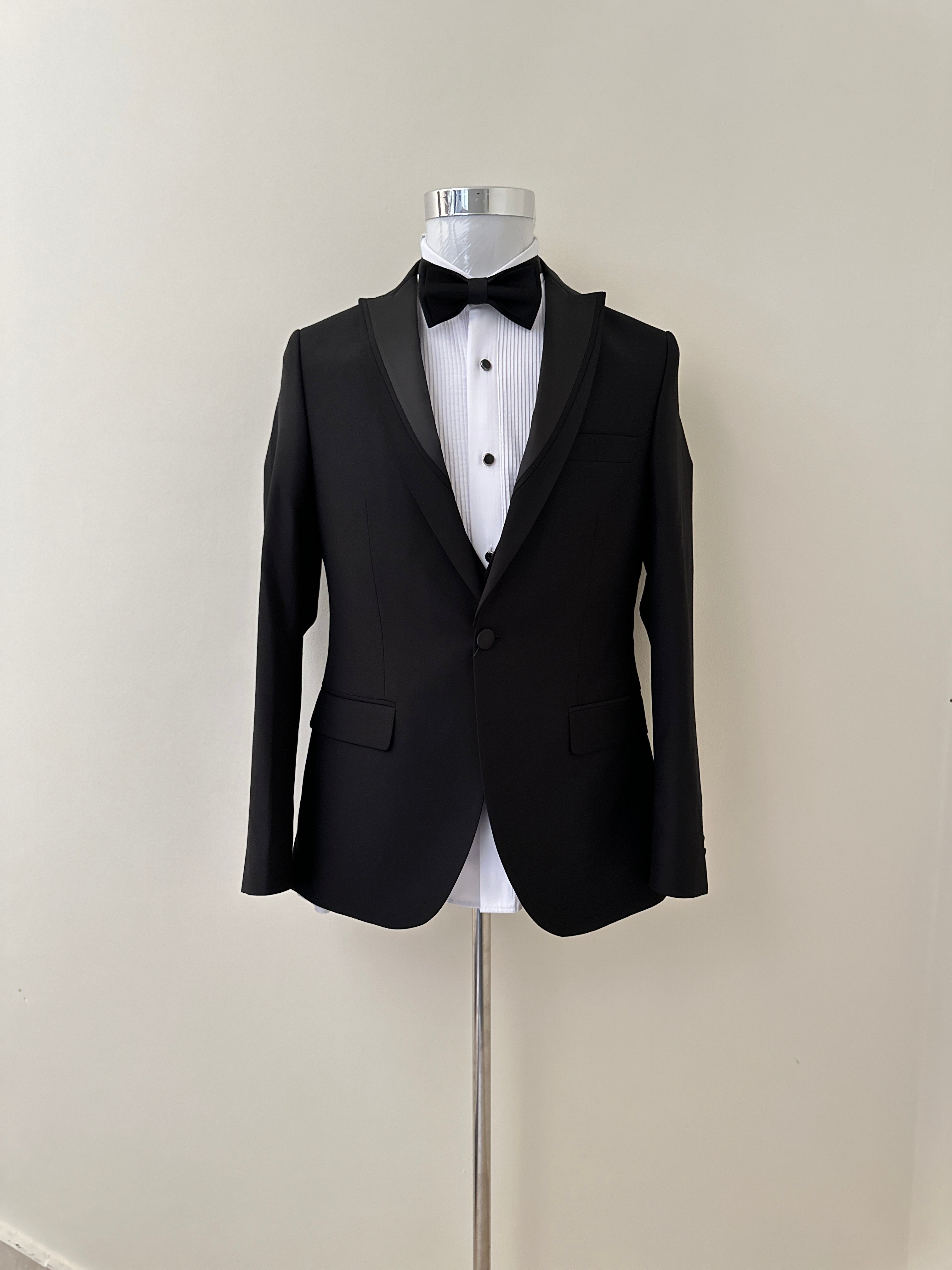 Elevate your formal wardrobe with this sophisticated peak satin lapel tuxedo set in classic black. Featuring a...